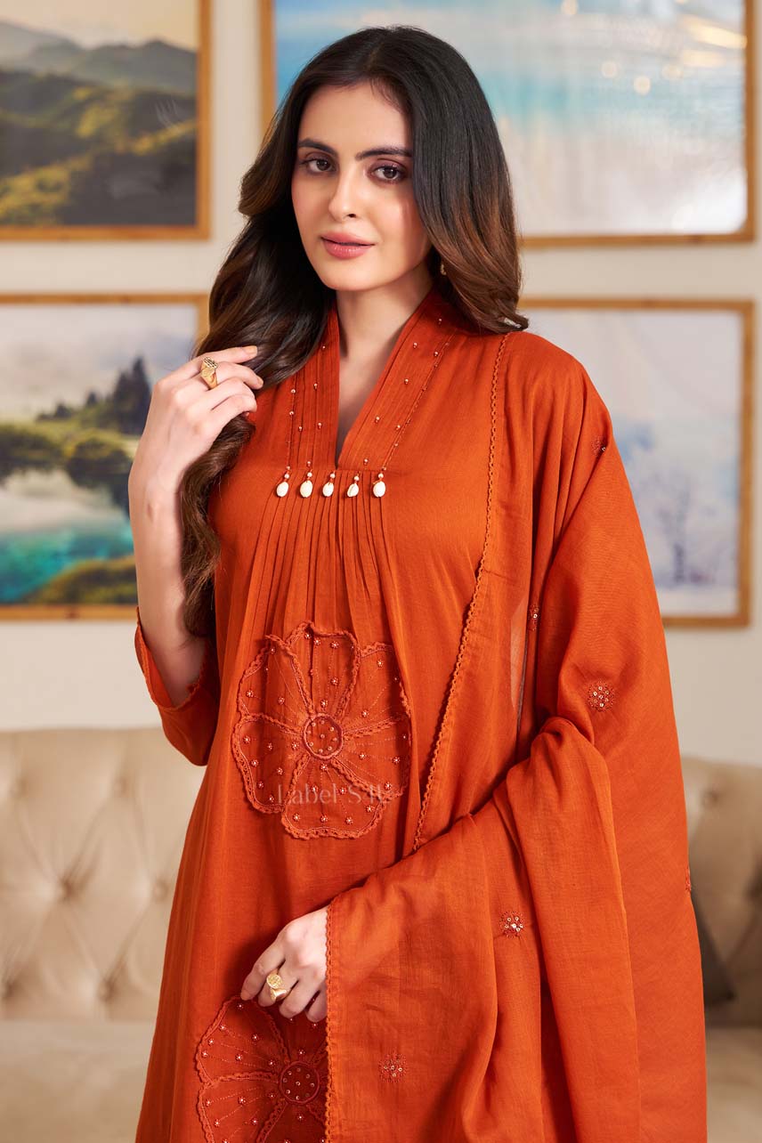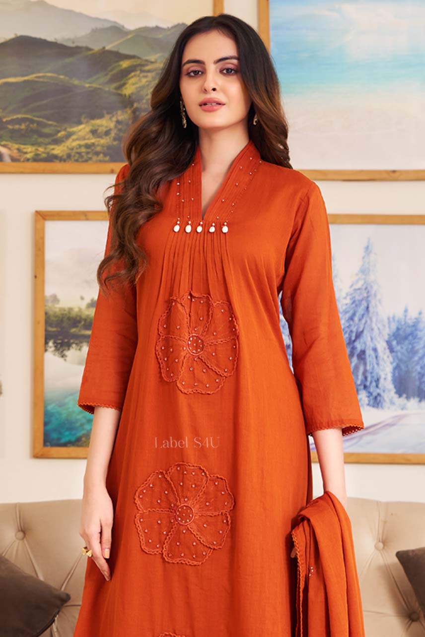 Crafted in breathable cotton, this tara-orange suit set blends earthy elegance with festive charm. Designed with subtle floral embroidery across the kurta and paired with matching straight pants and a coordinated dupatta, this set offers a graceful silhouette with all-day comfort. The orange tone adds richness, making it perfect for festive gatherings, poojas, functions, and celebration wear. Lightweight, timeless, and easy to style, this cotton ethnic suit set is ideal for women who love refined traditional wear with a modern, minimal touch.