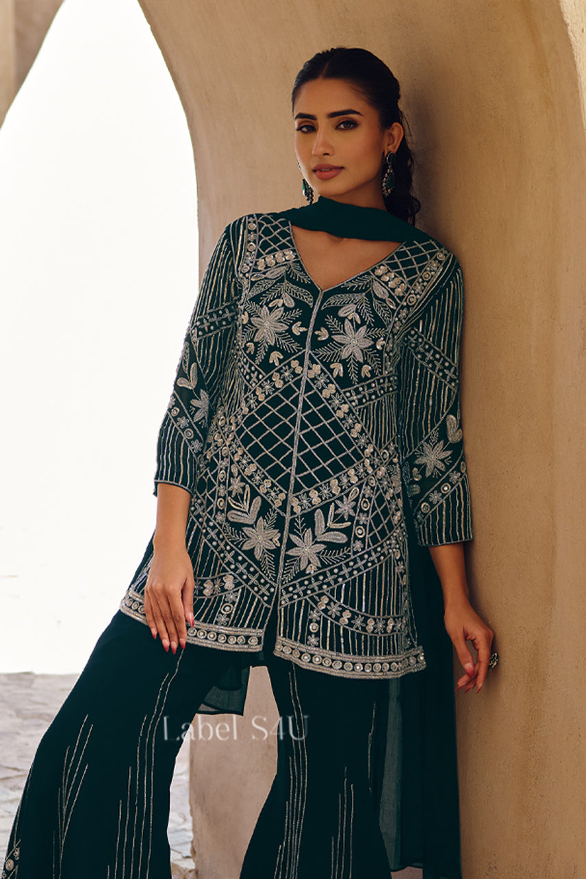 Elevate your style with the Shukran-Sharara Set. This elegant outfit showcases a handwork short kurta with shimmering thread and sequin detailing, paired with dramatic flared trousers for a regal and contemporary look. The delicate chiffon dupatta adds an ethereal touch, making this outfit perfect for making a statement with timeless elegance.