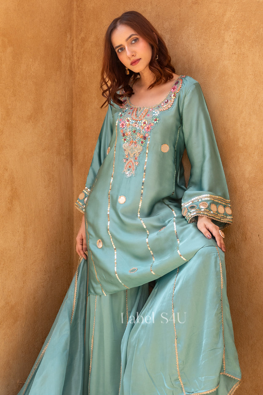 Step into effortless elegance with this aqua delicately embroidered palazzo set, featuring flowy sleeves and flared palazzo for a regal silhouette. Detailed mirror work and pastel thread embroidery add a festive sparkle. Made from soft, premium fabric, it’s perfect for pre-wedding events, sangeet nights, and special occasion wear. A statement ethnic set for your modern festive wardrobe.
