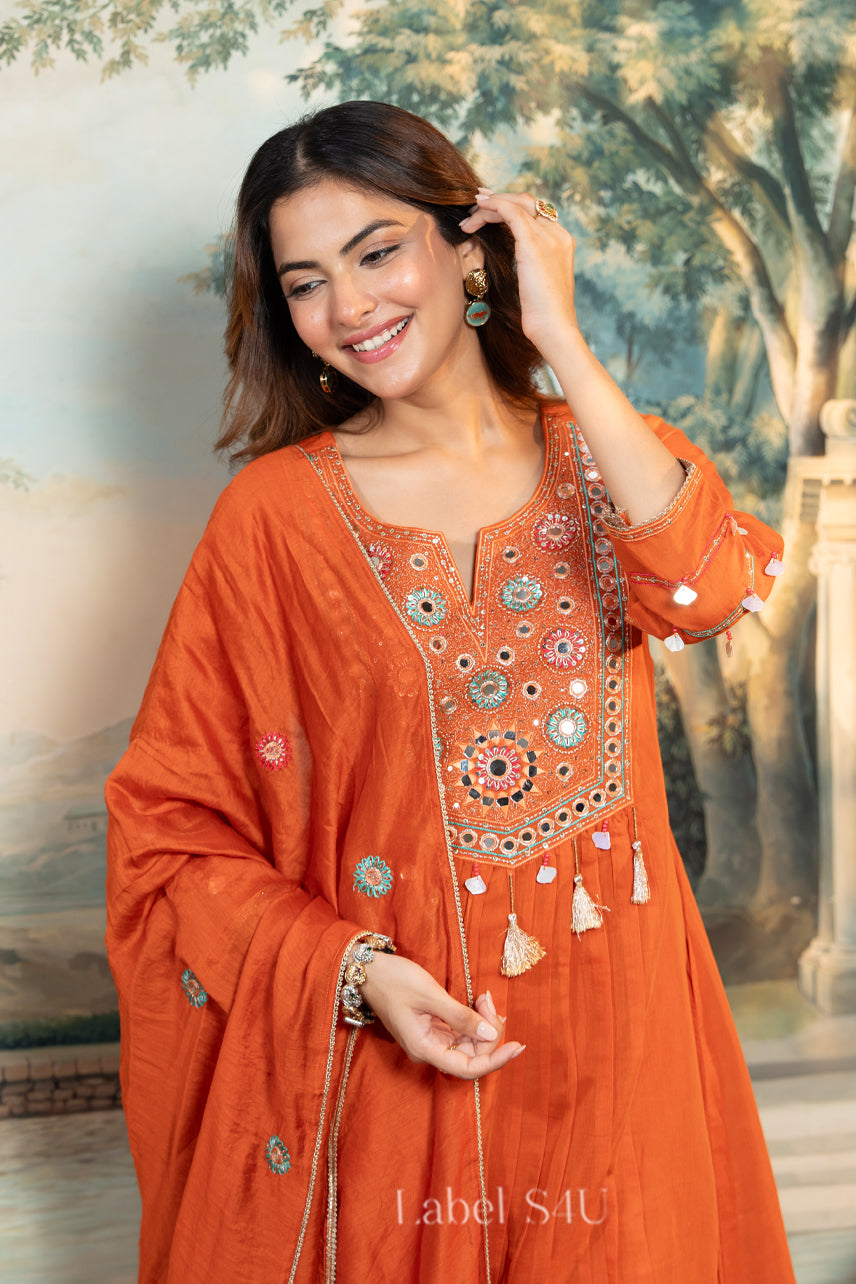 Illuminate your festive look with this stunning Orange Anarkali Set. The vibrant, rich orange hue is perfectly contrasted with intricate, real mirror work (Shisha/Abla work) along the yoke and hems, giving it a captivating sparkle. This comfortable yet elegant three-piece suit includes a beautiful A-line kurta, matching pants, and a flowy dupatta. Ideal for casual gatherings, festive brunches, or a day out and all your special occasions.