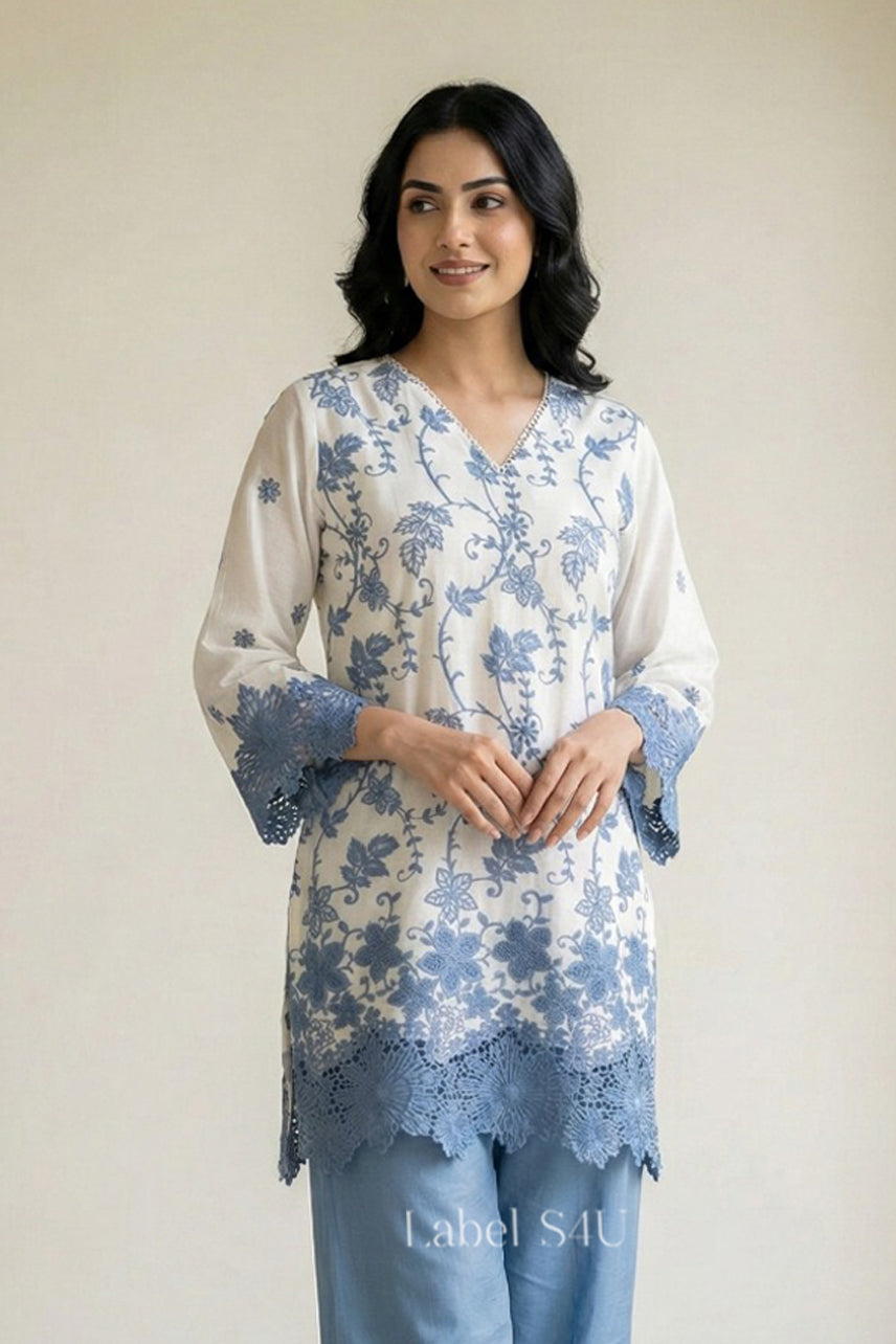 Soft, graceful, and easy to wear, this white-powder blue co-ord set features a straight silhouette with delicate tonal floral detailing and lace-finished sleeves and hem. Paired with coordinated straight pants, this refined, elegant daywear set blends comfort with subtle sophistication. Lightweight and breathable, it’s designed for effortless styling from morning to evening.