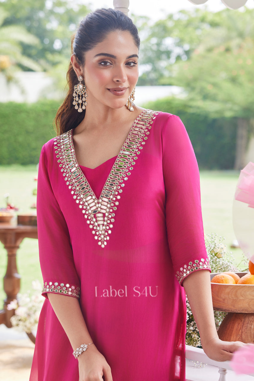 Step into the spotlight with Gulaabi Glow- Co-ord Set– a graceful magenta pink kurta set crafted in organza, adorned with intricate mirror work along the neckline and sleeves. Paired with straight pants and a coordinated inner, this set blends simplicity with shine, making it perfect for festive brunches, Rakhi celebrations, or elegant day events. Style it with minimal accessories and let the mirror accents do the talking!