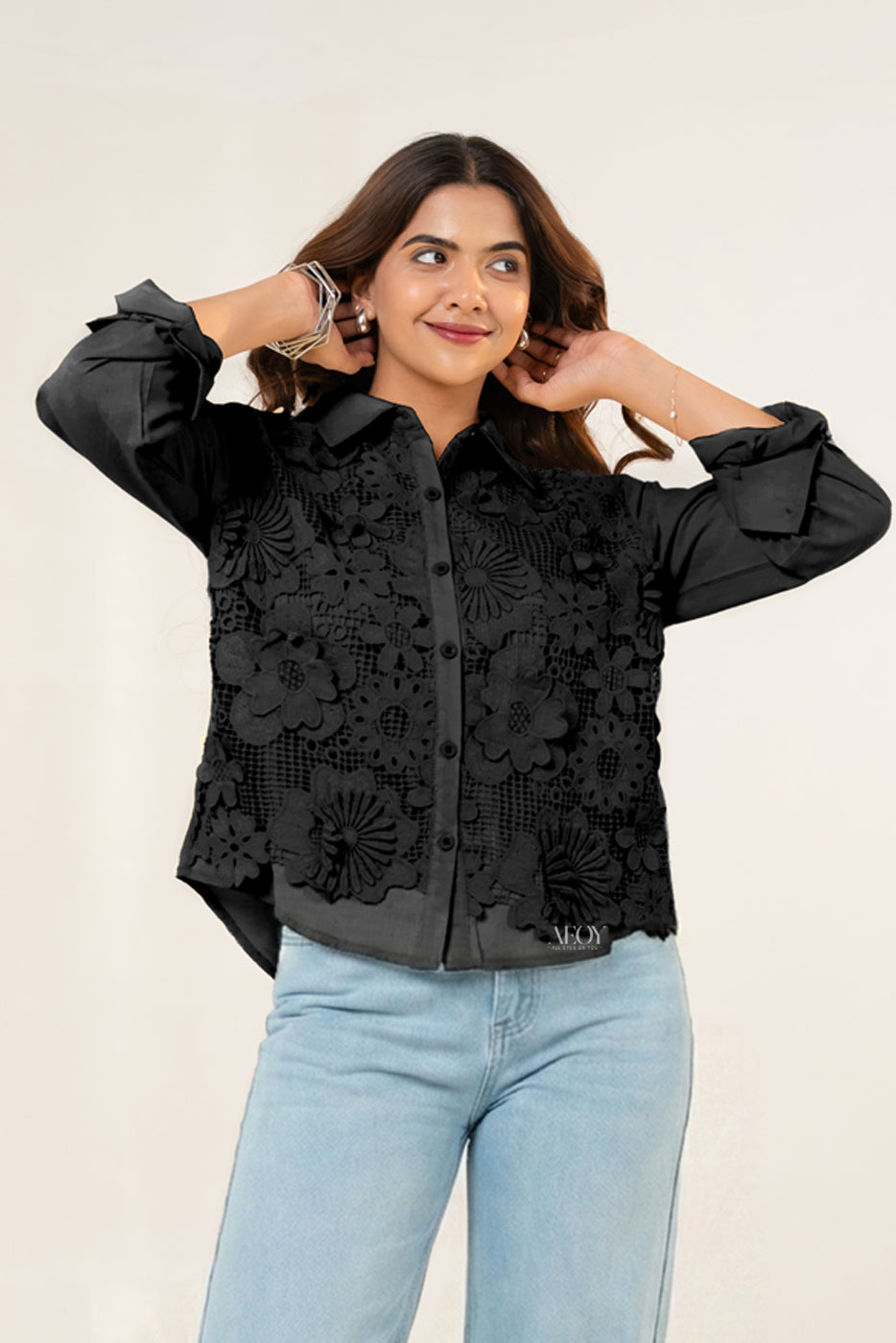 This black women’s cotton shirt features a regular-fit silhouette with a classic collared neckline and full sleeves, finished with delicate lace detailing along the collar, sleeves, and hem for a refined feminine look. Made from breathable cotton with a soft, lightweight feel, it ensures comfort through long hours. Designed for effortless elegance, this black shirt for women works perfectly for professional settings while staying relaxed enough for casual meetings and brunches.