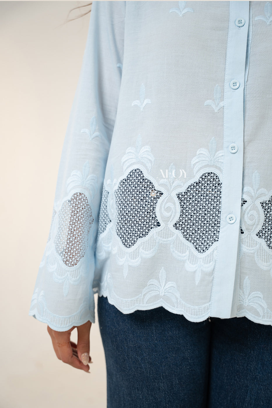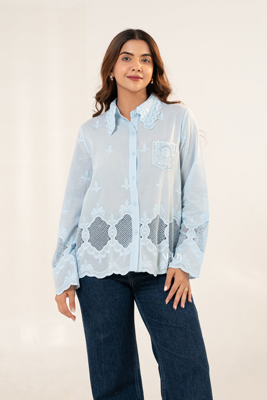 This light blue women’s cotton shirt features a regular-fit silhouette with a classic collared neckline and full sleeves, finished with delicate lace detailing along the collar, sleeves, and hem for a refined feminine look. Made from breathable cotton with a soft, lightweight feel, it ensures comfort through long hours. Designed for effortless elegance, this Light Blue shirt for women works perfectly for professional settings while staying relaxed enough for casual meetings and brunches.