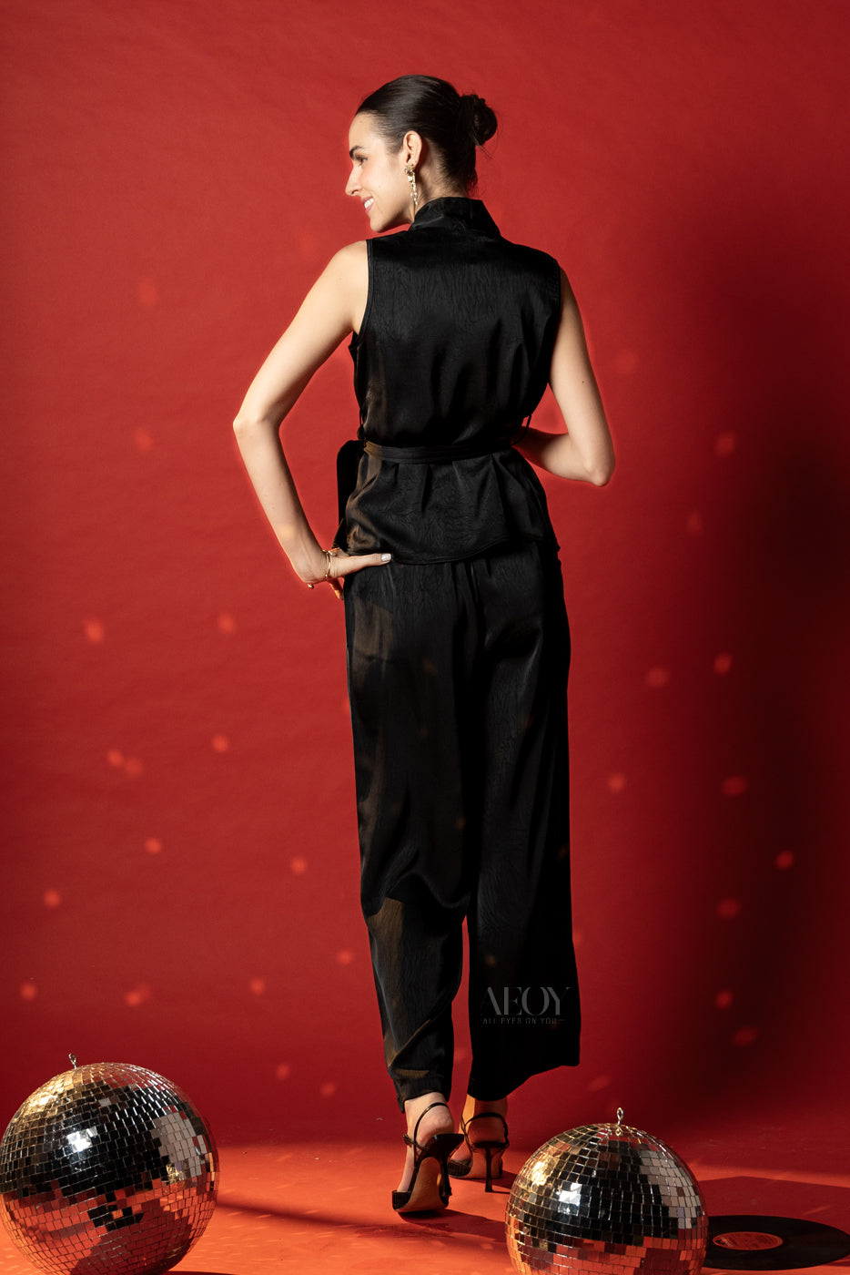 Unleash effortless elegance in this sleeveless co-ord party set — a luxe satin-textured ensemble in black and rich berry tones. The tailored wrap-style top with a flattering waist tie and flowy trousers is your answer to a non-dress party outfit that still turns heads. Perfect for cocktail parties, evening dinners, and New Year toasts — this chic partywear coord is where confidence meets glam.