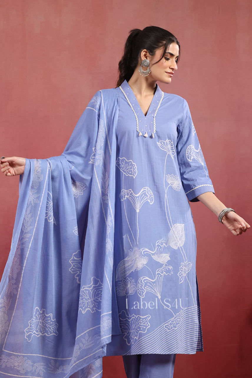 Grace meets comfort in this elegant blue suit set designed for effortless festive dressing. The straight-fit kurta features delicate white floral line prints with a tassel-tie neckline, paired with matching pants and a flowy printed dupatta. Crafted in a soft, breathable fabric with a smooth fall, it feels light and easy for all-day wear. A versatile pick that blends simplicity with refined charm.