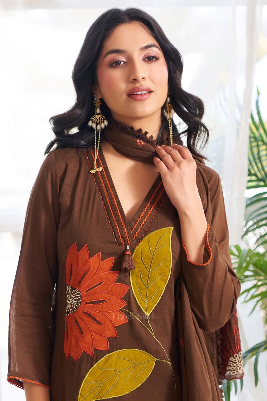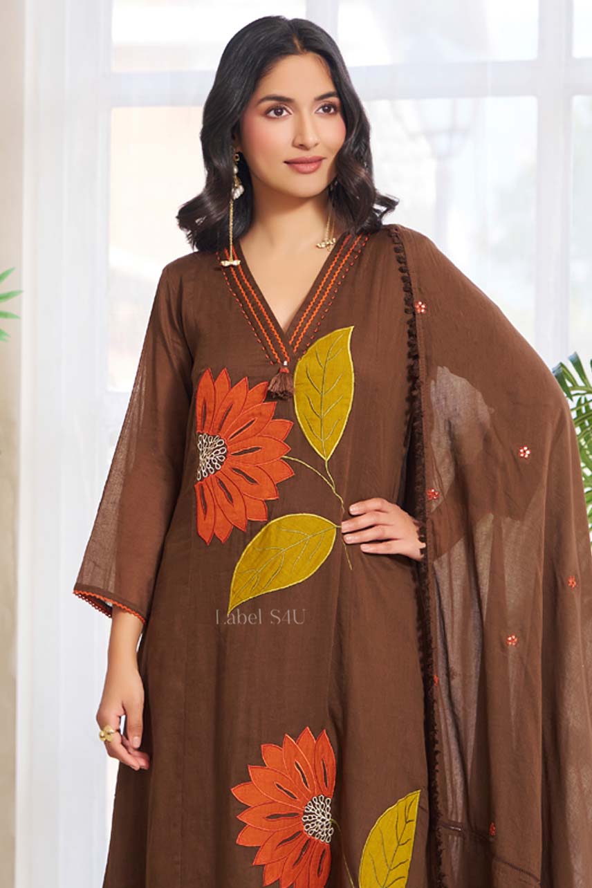 Crafted in breathable cotton, this brown anarkali set features bold sunflower-inspired motifs on the kurta, paired with straight pants and a coordinated dupatta. Rich, earthy, and statement-making, it’s perfect for festive gatherings, family functions, and daytime celebrations. A comfortable yet striking ethnic ensemble designed for modern traditional wear.