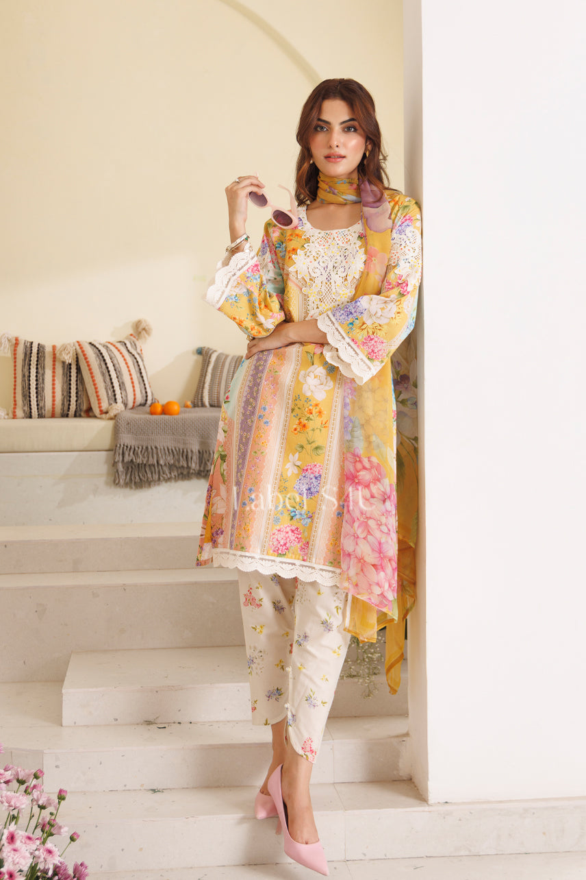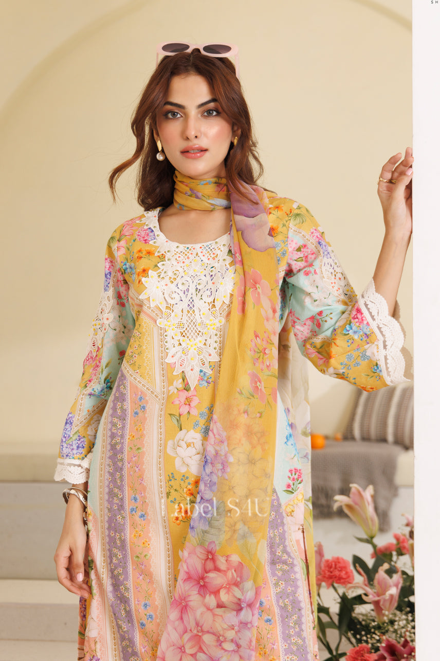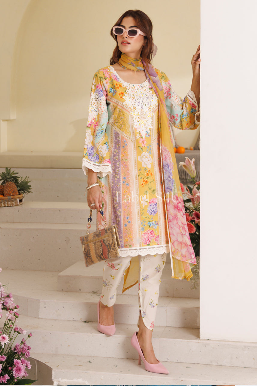 Bask in the vibrant charm of Zehra Zest — a pastel-hued celebration of florals and femininity. This three-piece ensemble features a flowy printed kurta adorned with intricate lace detailing, paired with delicate printed trousers and a soft, lightweight dupatta. From brunch dates to festive gatherings, this look is all about elegance with a fresh, playful twist. Just add your favorite heels and shades for that effortlessly chic finish.