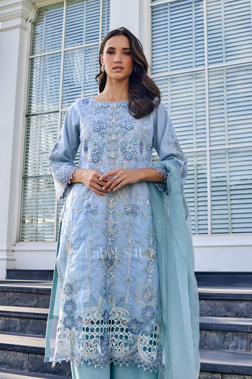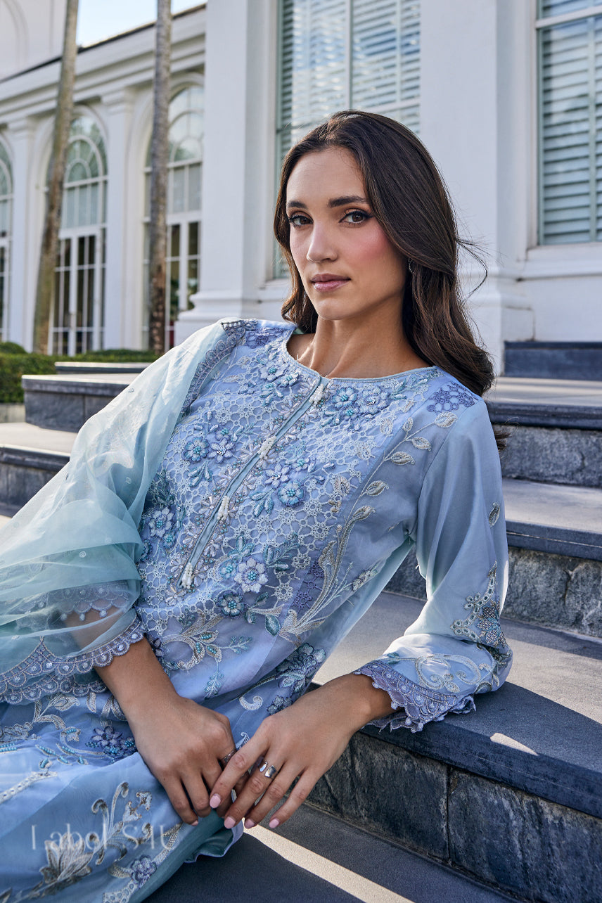 Soft pastel tones meet timeless embroidery in this refined pastel blue suit set, designed for effortless festive dressing. The straight-fit kurta is adorned with delicate thread embroidery and scalloped lace detailing, paired with coordinated pants and a sheer dupatta for a graceful finish. Lightweight and breathable, this ensemble offers all-day comfort with an understated festive charm perfect for elegant celebrations.