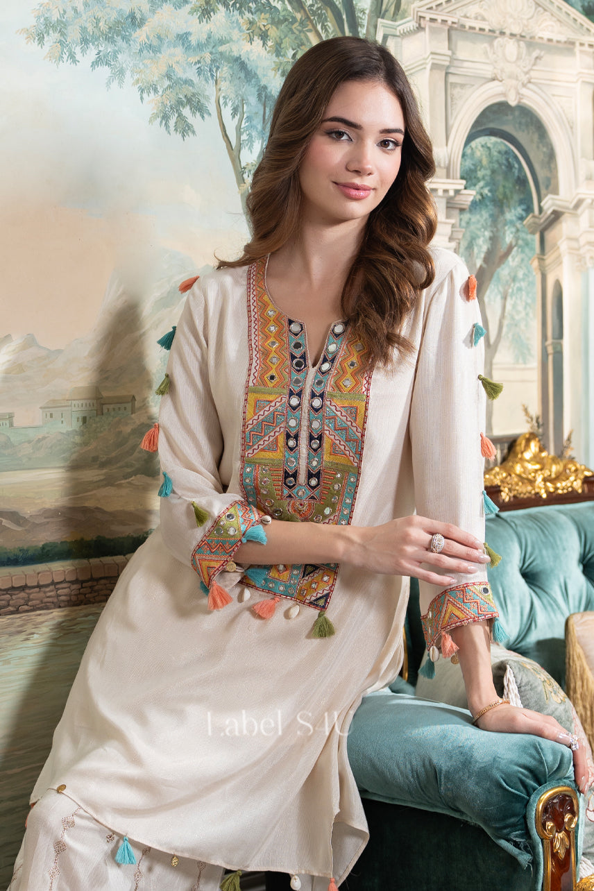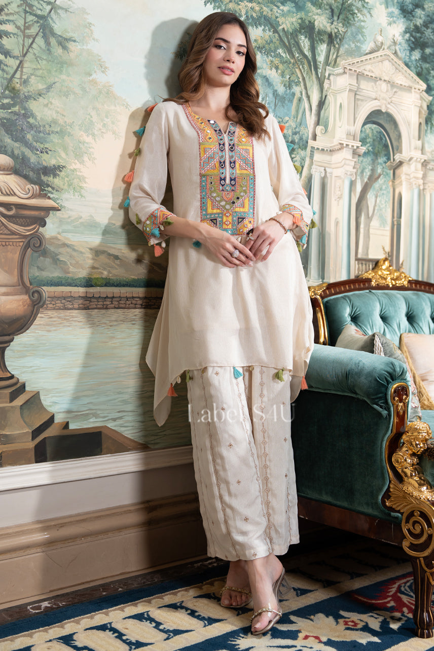 Elevate your wardrobe with this elegant Ivory Embroidered Kurta Pant Set, a perfect blend of sophistication and contemporary ethnic charm. Crafted in a refined, lightweight fabric, the kurta features a beautifully multicolored thread-embroidered yoke that adds a vibrant artistic touch to the serene ivory base. The relaxed asymmetrical hemline, adorned with playful tassels, gives the outfit a chic, youthful appeal. The sleeves are enhanced with matching embroidery and delicate tassel accents, making every detail stand out with finesse. Paired with intricately cut-work embellished straight pants, this set offers a graceful silhouette that is comfortable, stylish, and effortlessly festive.