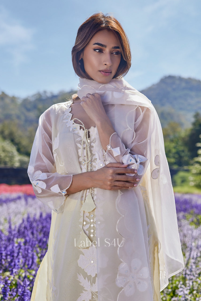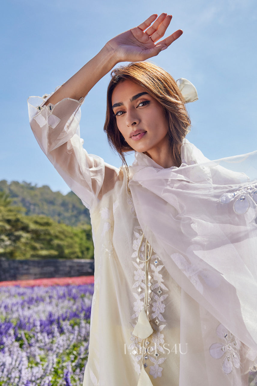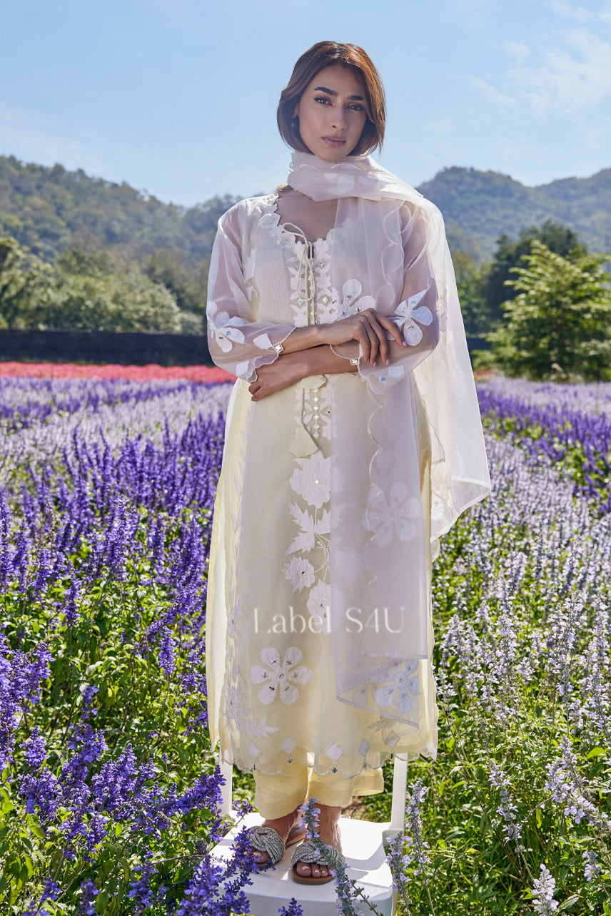 Step into timeless elegance with this ethereal Organza Suit Set designed in a soft pastel hue with delicate floral embroidery. The straight kurta features sheer sleeves and subtle front detailing, paired with matching bottoms and a lightweight dupatta for a graceful finish. Crafted in airy organza with a smooth lining, it feels light yet structured, perfect for long festive hours.
