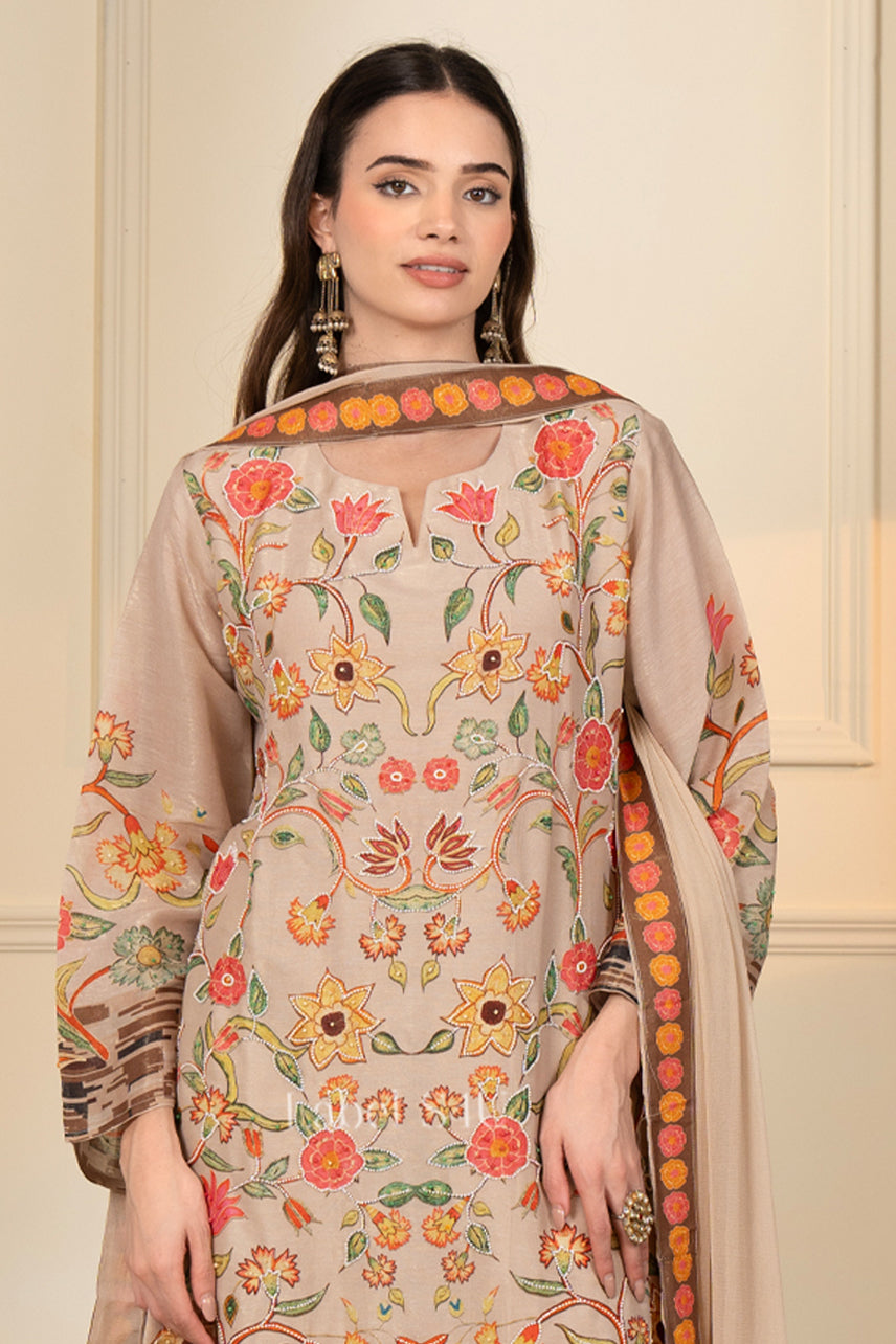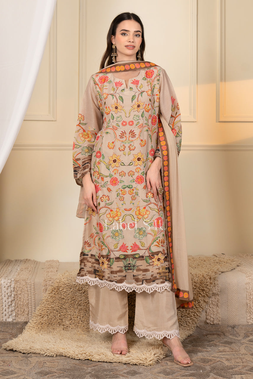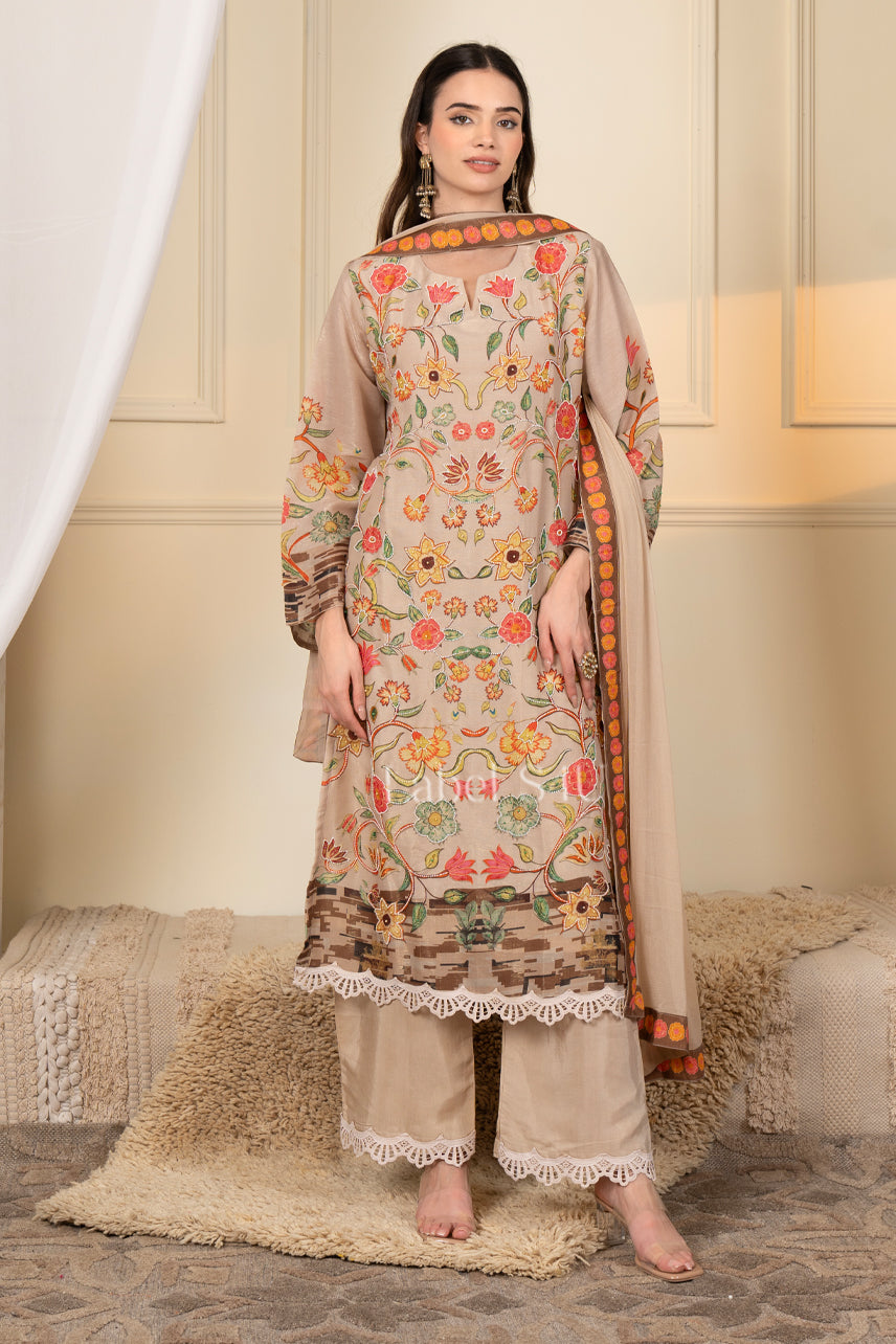 Step into timeless elegance with this beautifully crafted festive suit set designed for modern celebrations. Featuring a straight-cut, floral printed kurta with intricate multicoloured motiwork, it is paired with scallop-detailed pants and a coordinated dupatta. The soft, breathable fabric offers all-day comfort while the detailed border and delicate lace finishing add a refined festive touch.