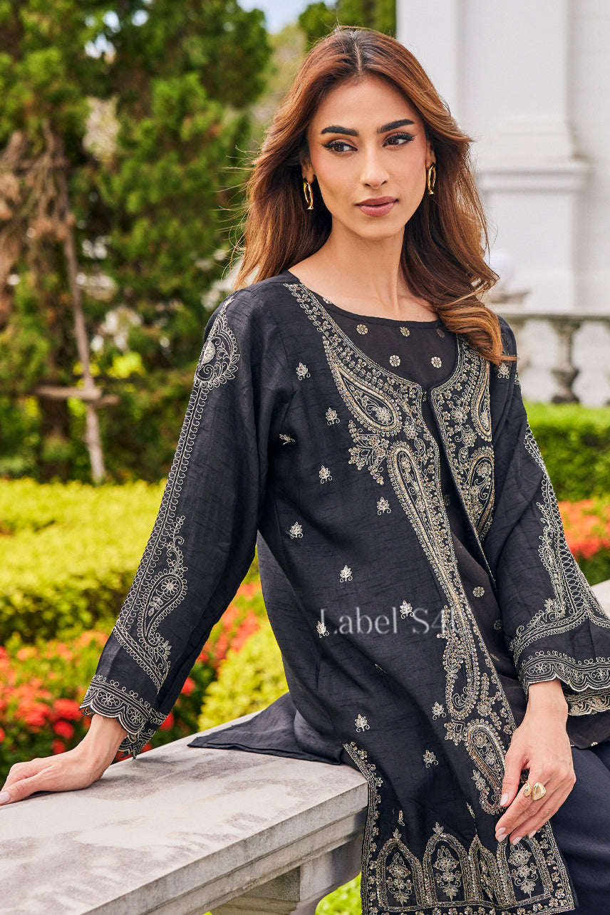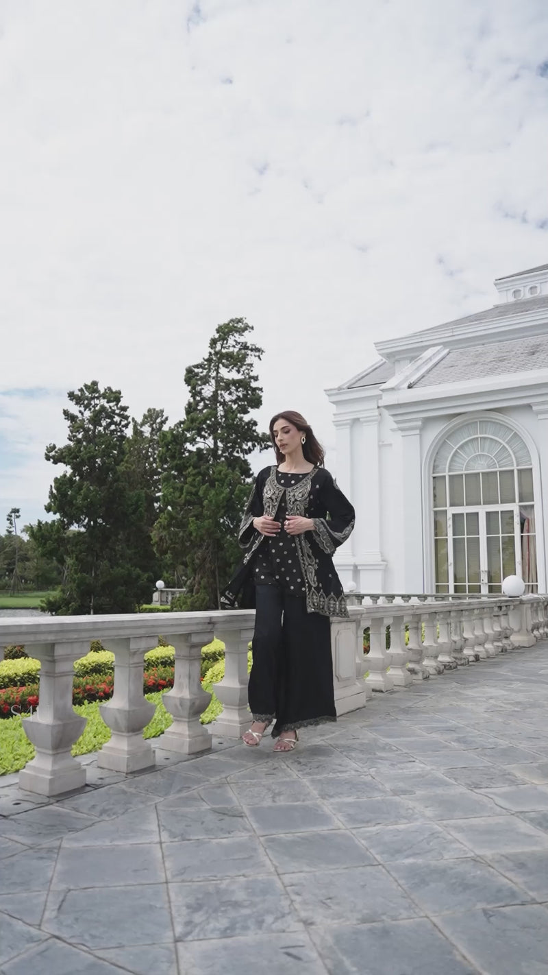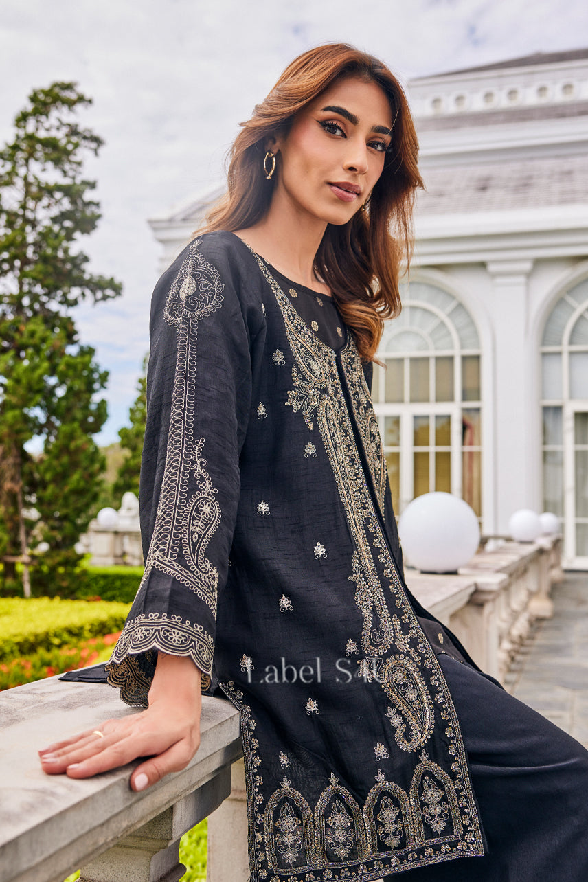 Make a bold yet refined statement in this elegant black embroidered co-ord set, designed with intricate silver-toned embroidery on a relaxed straight kurta. Paired with flowy wide-leg pants and a coordinated inner, this festive party set blends traditional detailing with a modern silhouette. Lightweight and comfortable, it’s perfect for women who want effortless glamour for special occasions.