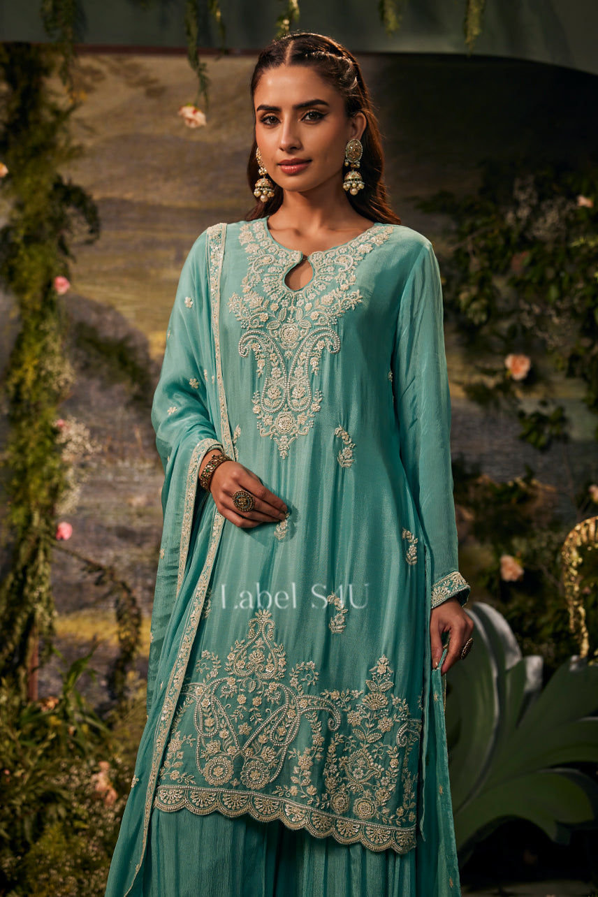 This aqua blue handwork palazzo set features delicate thread and sequin handwork on the neckline, hem, and sleeves, crafted in a soft, flowy chinon fabric for effortless elegance. Paired with a matching palazzo and dupatta, it creates a graceful festive silhouette. Perfect for women who love refined ethnic wear, this set is ideal for festive occasions, weddings, intimate celebrations, and evening gatherings. Style it with statement earrings and juttis for a polished traditional look.