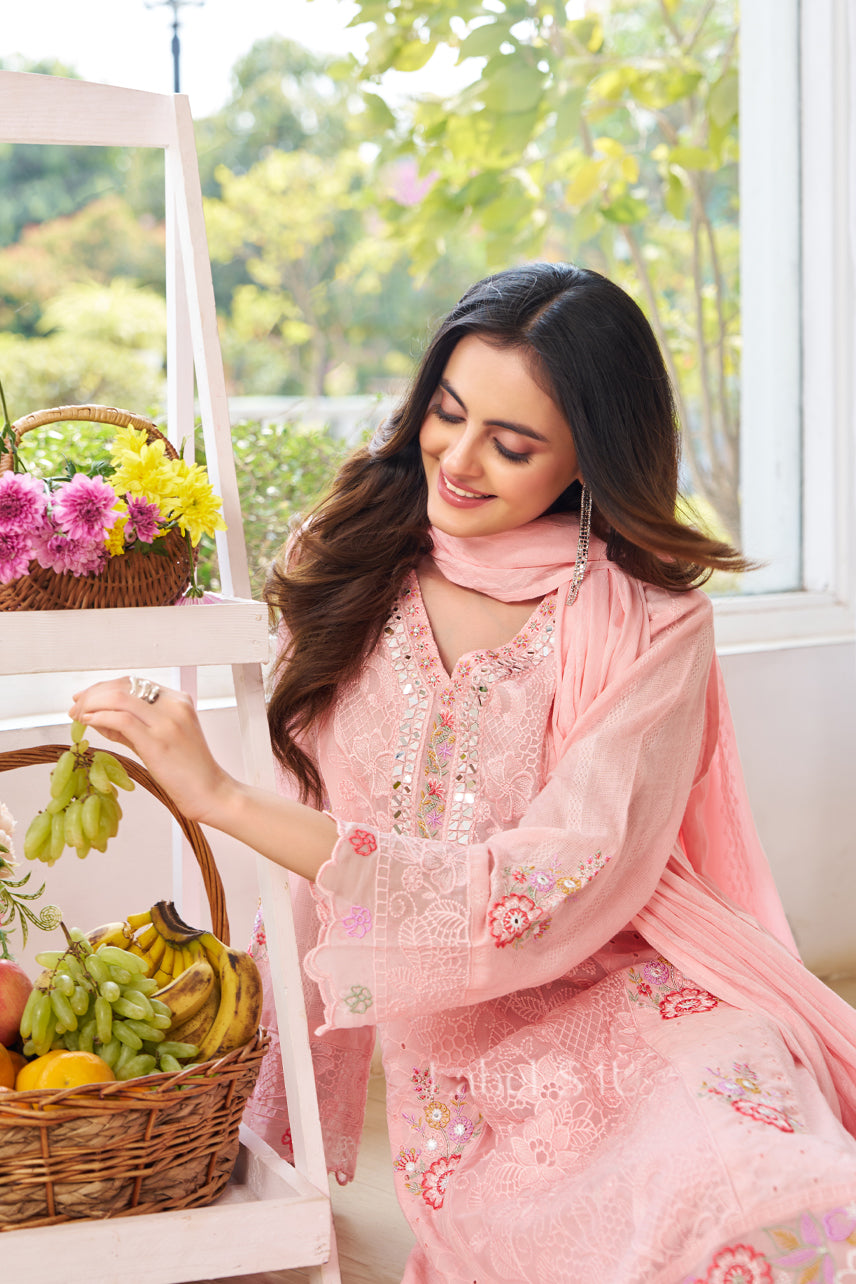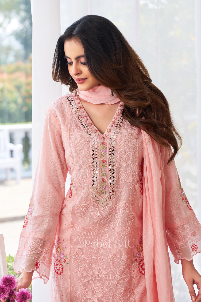 This graceful suit set reflects the softness and beauty of ethnic suits. Designed in a soothing pastel shade, it features delicate embroidery that adds charm without overpowering the look. The straight silhouette offers a flattering and comfortable fit, making it perfect for long festive days and intimate gatherings. The coordinated bottom and dupatta complete the outfit beautifully, creating a balanced and elegant look. Ideal for pooja ceremonies, festive celebrations, family functions, and summer occasions, this suit set blends simplicity with timeless Indian aesthetics.