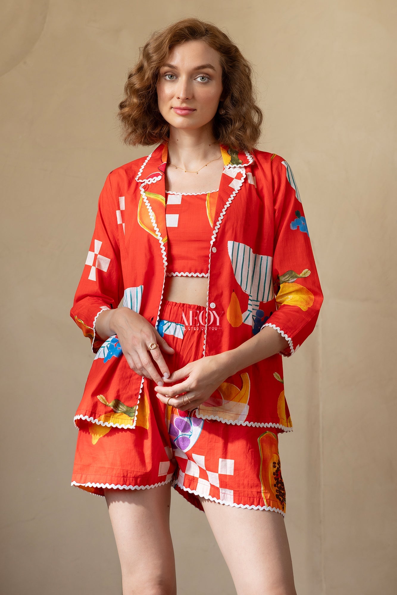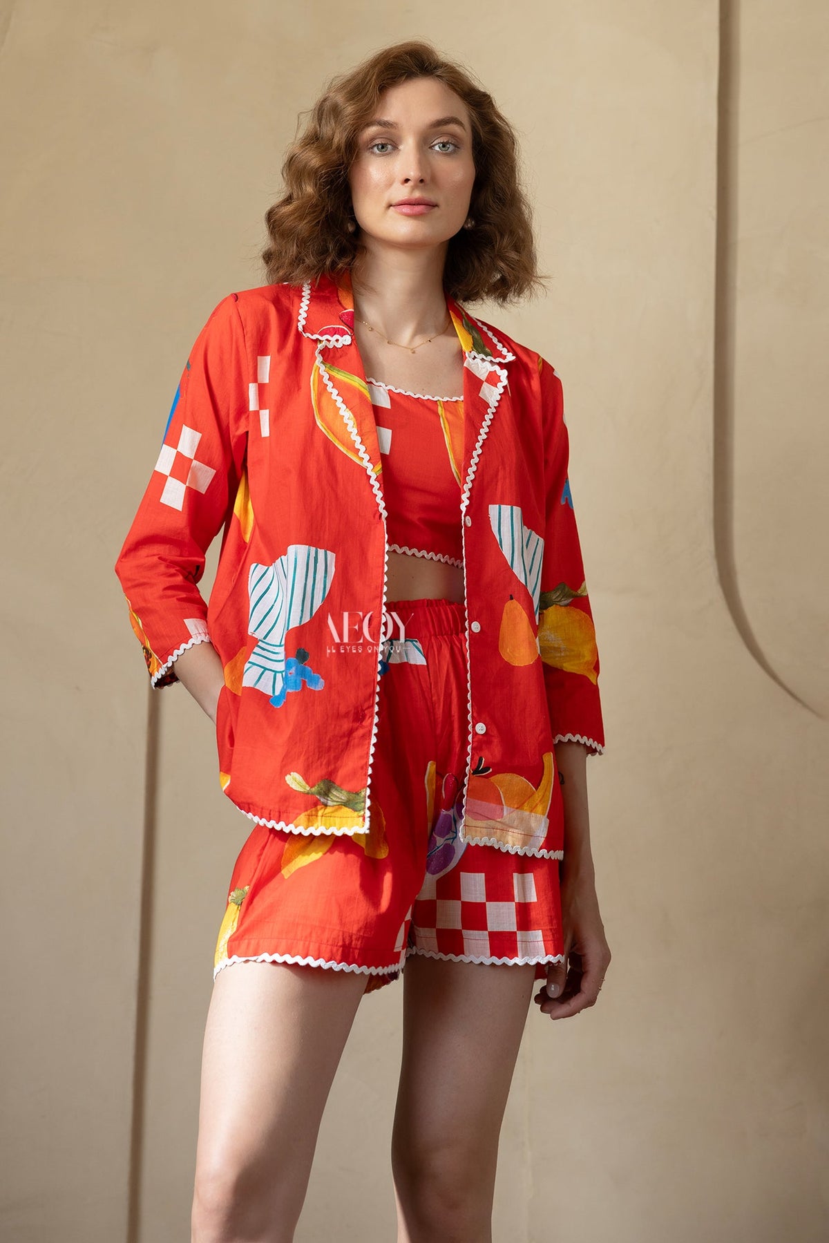 Unleash your playful side with the Rosy Route Short-Set, featuring a relaxed, button-down shirt with whimsical fruit motifs and vibrant checkerboard prints, this set captures the carefree spirit of sunlit brunches and lazy beach days.