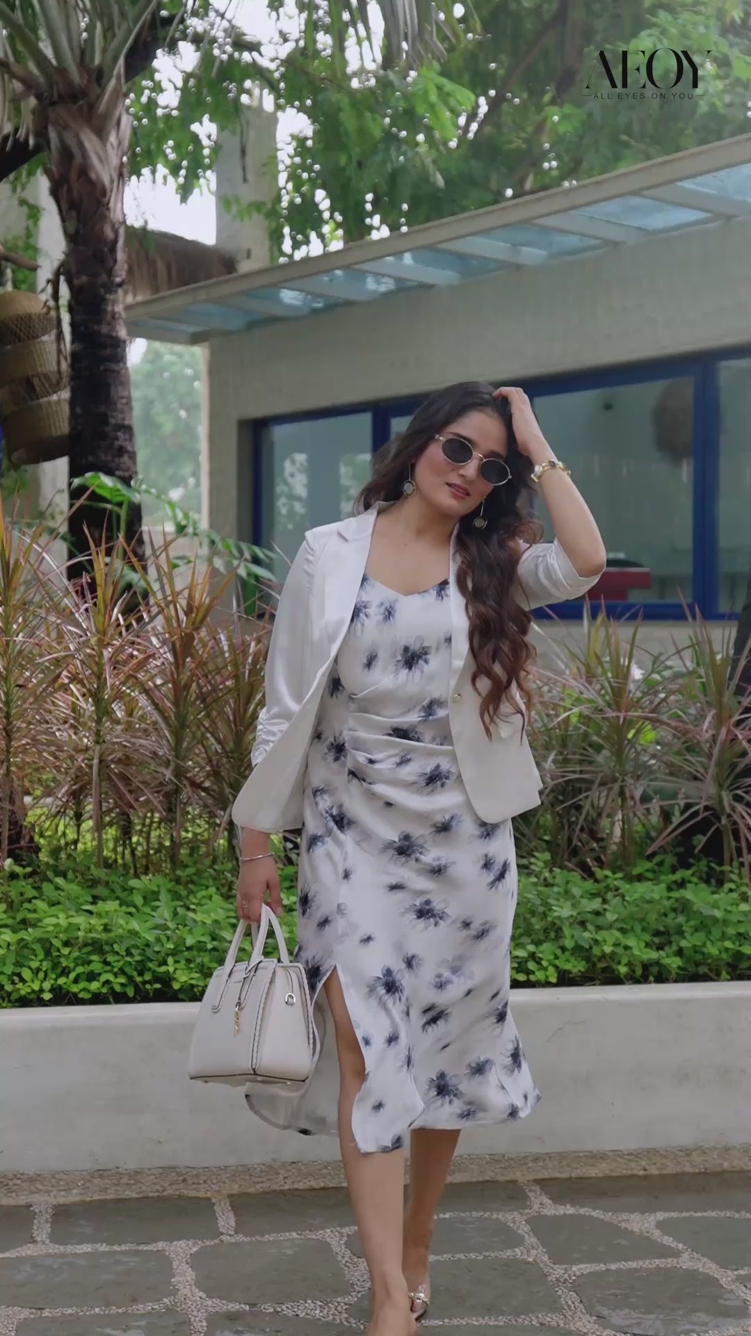 Turn heads in this elegant Grey floral satin co-ord set featuring a fitted camisole dress and a luxe silk-finish blazer. Perfect for office parties, formal brunches, and evening affairs, this printed satin dress with blazer is your go-to for effortless sophistication. The soft shimmer adds a festive glow while the midi length keeps it classy. Style it as a wedding guest outfit, a cocktail dinner look, or a stylish business event ensemble — it does it all.