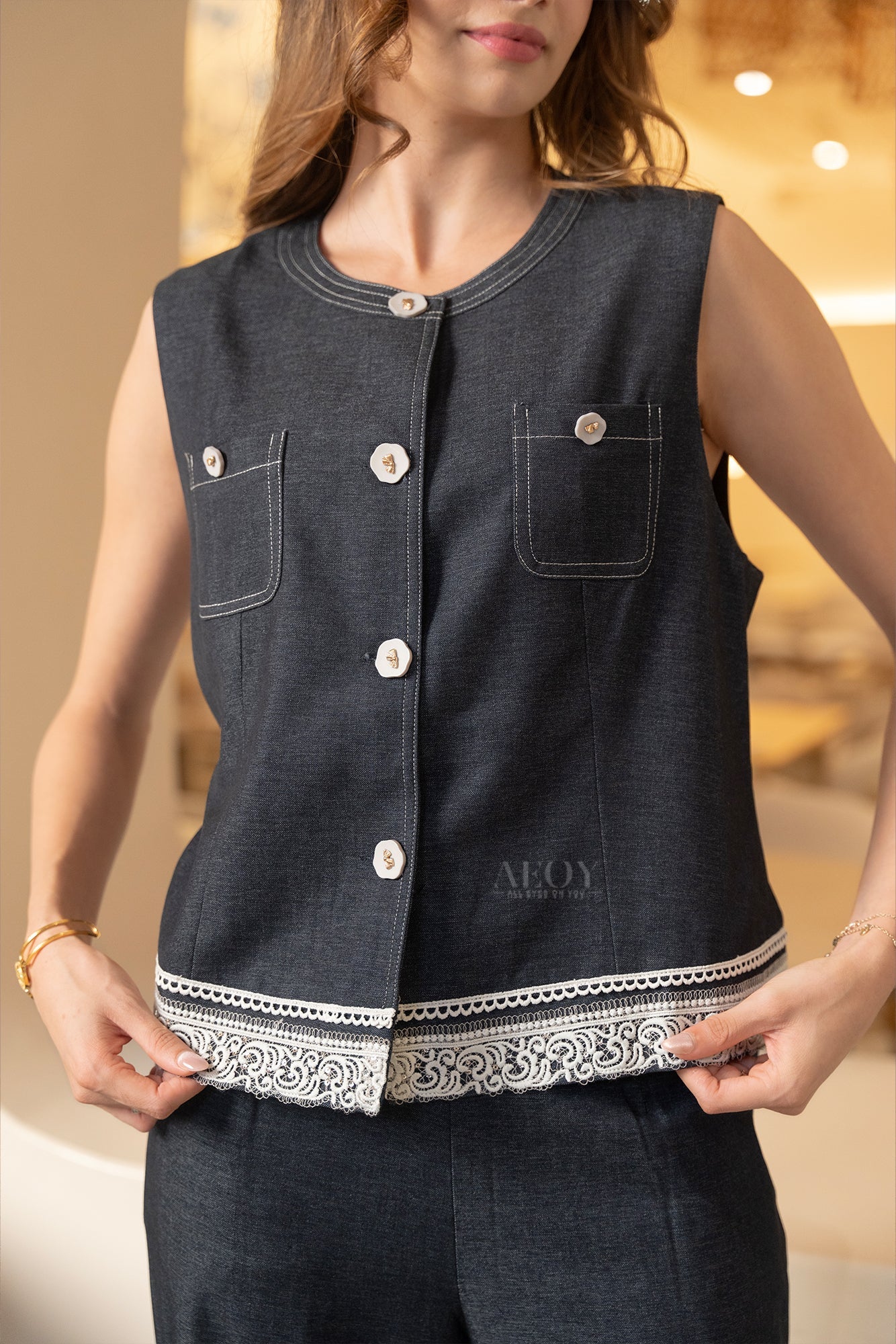 Turn heads with this structured sleeveless Dark blue denim coord set, featuring a statement lace hem, silver buttons, and contrast white stitch detailing for a crisp finish. The tailored trousers flatter all silhouettes, while the versatile vest top brings a vintage twist to modern fashion. Whether you're heading to a coffee date, brunch meeting, or evening stroll, this piece blends comfort and polish.