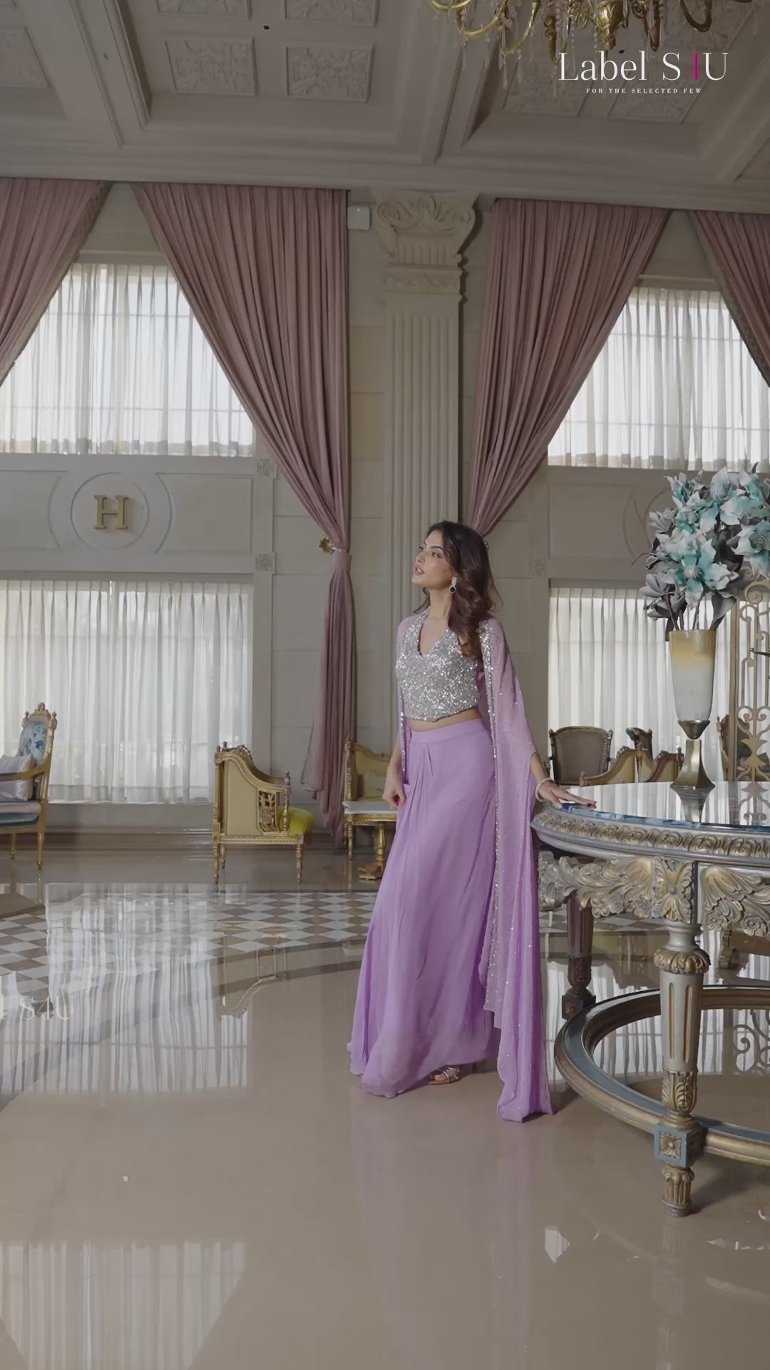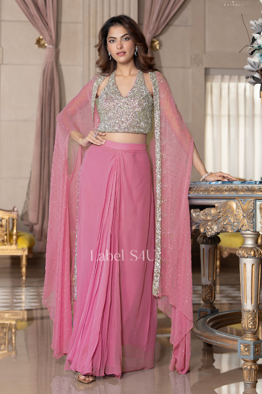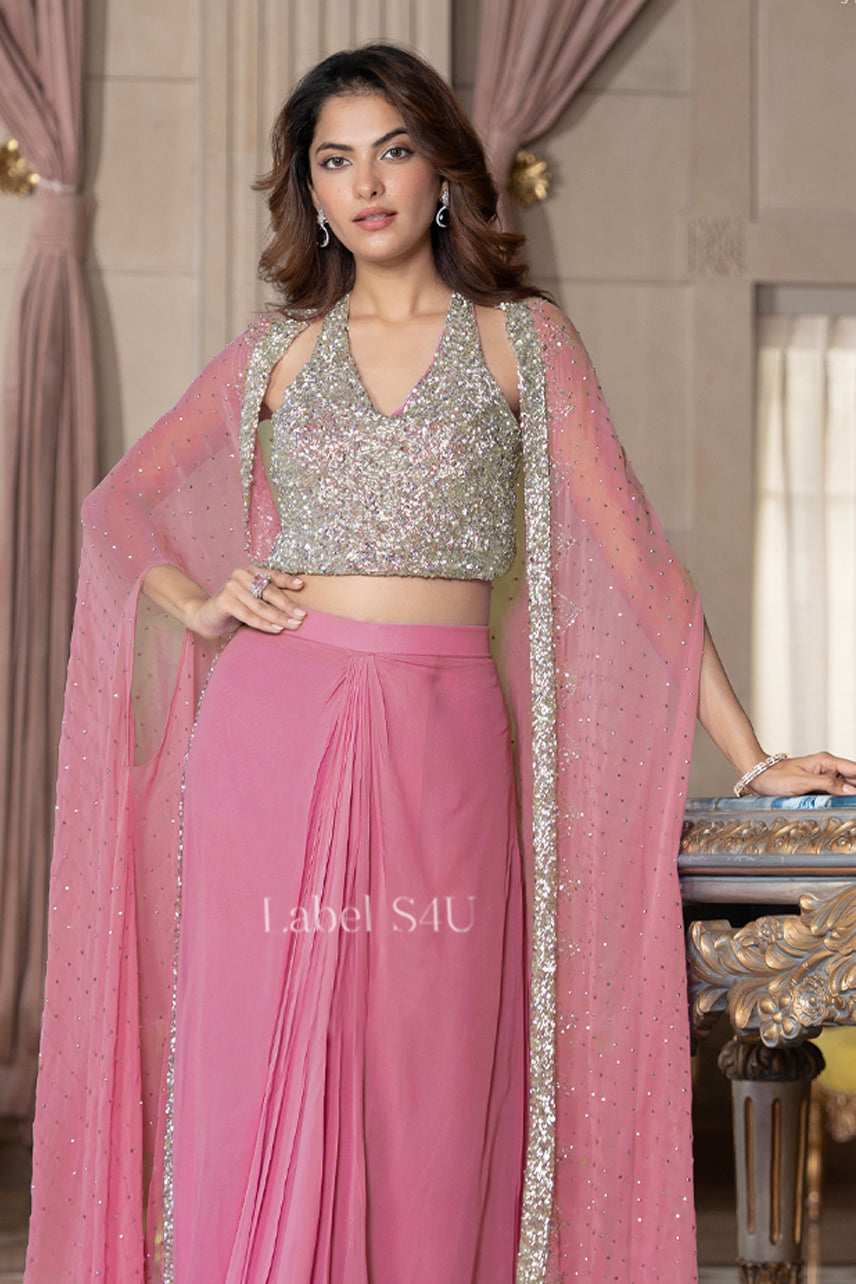Mint green Indo-Western cape set featuring a heavily hand-embroidered silver sequin crop top, paired with an elegant draped skirt and a delicate cape adorned with sparkling embellishments. The cape adds a modern twist to the traditional silhouette, making it perfect for weddings, receptions, cocktail parties, and festive occasions. Crafted in lightweight georgette for an effortless drape, this outfit ensures comfort with glam. Style it with statement earrings and heels for a royal chic look.