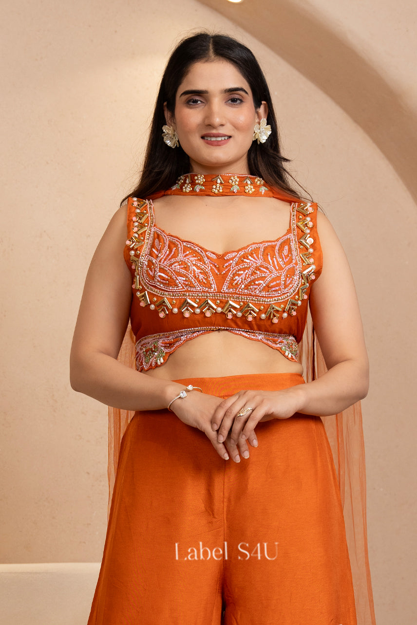 For the bridesmaid who’s bold, beautiful, and always on-trend — this Papa Don’t Preach style is just what your bridal squad needs. Designed in refreshing colors with detailed handwork and flowy silhouettes. Featuring a soft lime base with handwork,  this Indo-Western outfit blends playful elegance with bold confidence. The embellished bustier with a peek-a-boo cutout and matching palazzos brings together fusion fashion and desi drama, making it perfect for weddings, mehendi functions, sangeet nights, or a stylish bridesmaid look.