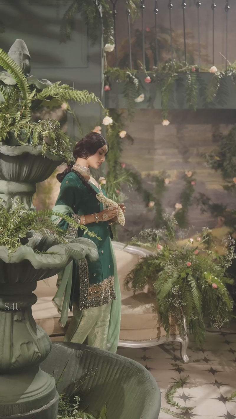 This rich green handwork suit set features intricate handwork on the neckline, sleeves, and hem, paired with a contrasting brocade pant. Crafted in a lightweight crepe fabric, it offers a subtle festive sheen. Perfect for women who love elegant ethnic wear for festivals, family functions, and evening celebrations. Style with statement juttis or heels for a polished festive look.