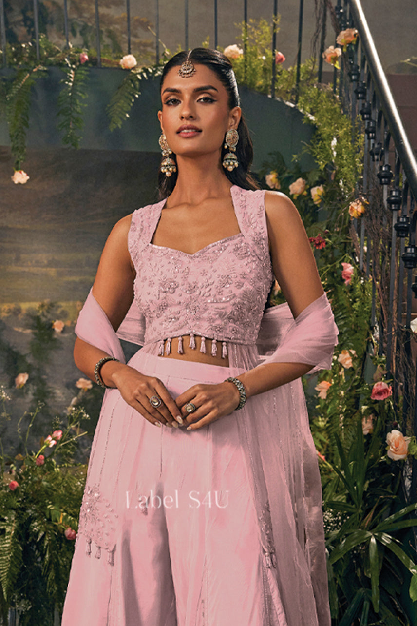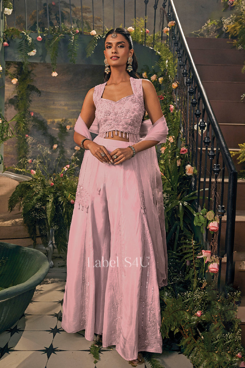 This Blue handwork Indo-Western palazzo set is perfect for women seeking elegant festive and occasion wear. Featuring a finely embroidered sleeveless blouse, flowy palazzo pants, and a sheer embellished dupatta, it offers a graceful silhouette with effortless comfort. Ideal for Eid celebrations, wedding functions, cocktail evenings, and festive parties, this outfit blends modern charm with timeless ethnic elegance.