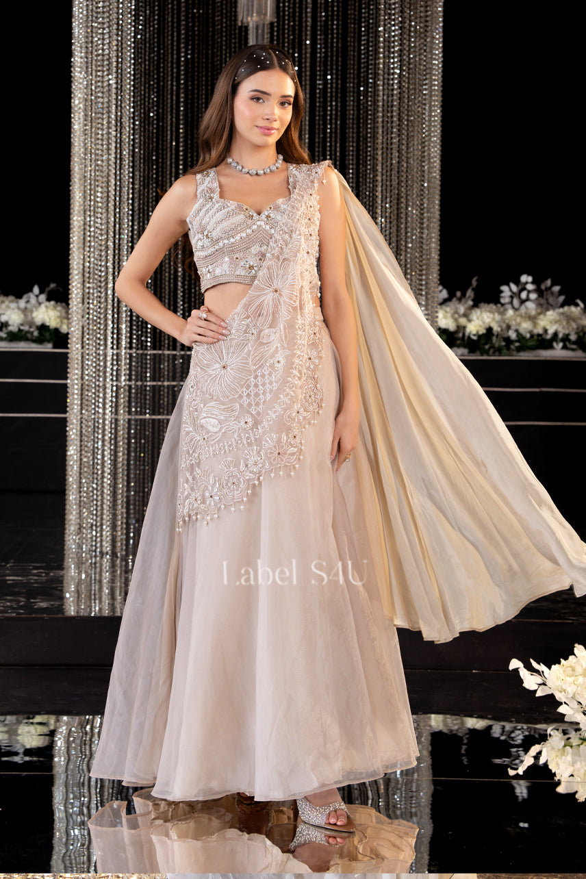 Elevate your festive style with this elegant beige lehenga set featuring a beautifully hand-embroidered blouse and a delicately embellished drape. The flowing organza skirt adds graceful movement, making it perfect for weddings, receptions, and special celebrations. A blend of modern charm and traditional craftsmanship, this outfit ensures you stand out with effortless sophistication.