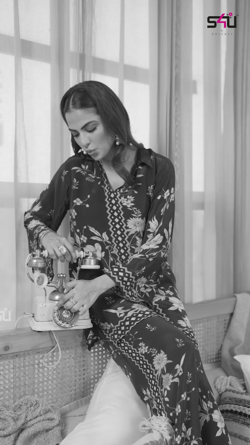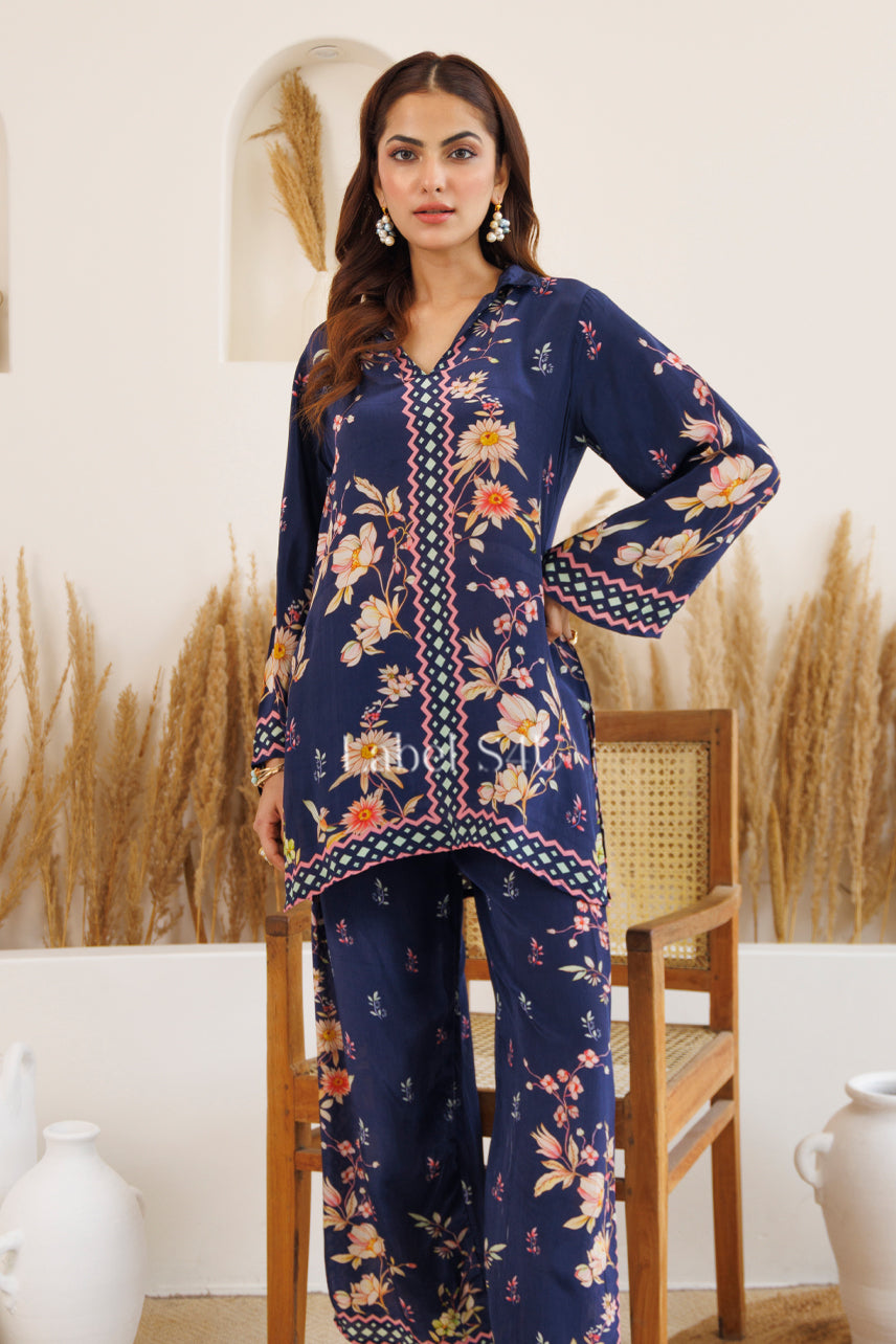 This elegant indigo co-ord set is designed with intricate floral prints and accented with vibrant borders. The flowy silhouette, wide sleeves, and relaxed pants offer both comfort and sophistication, making it a versatile choice for daytime events or relaxed evening outings.