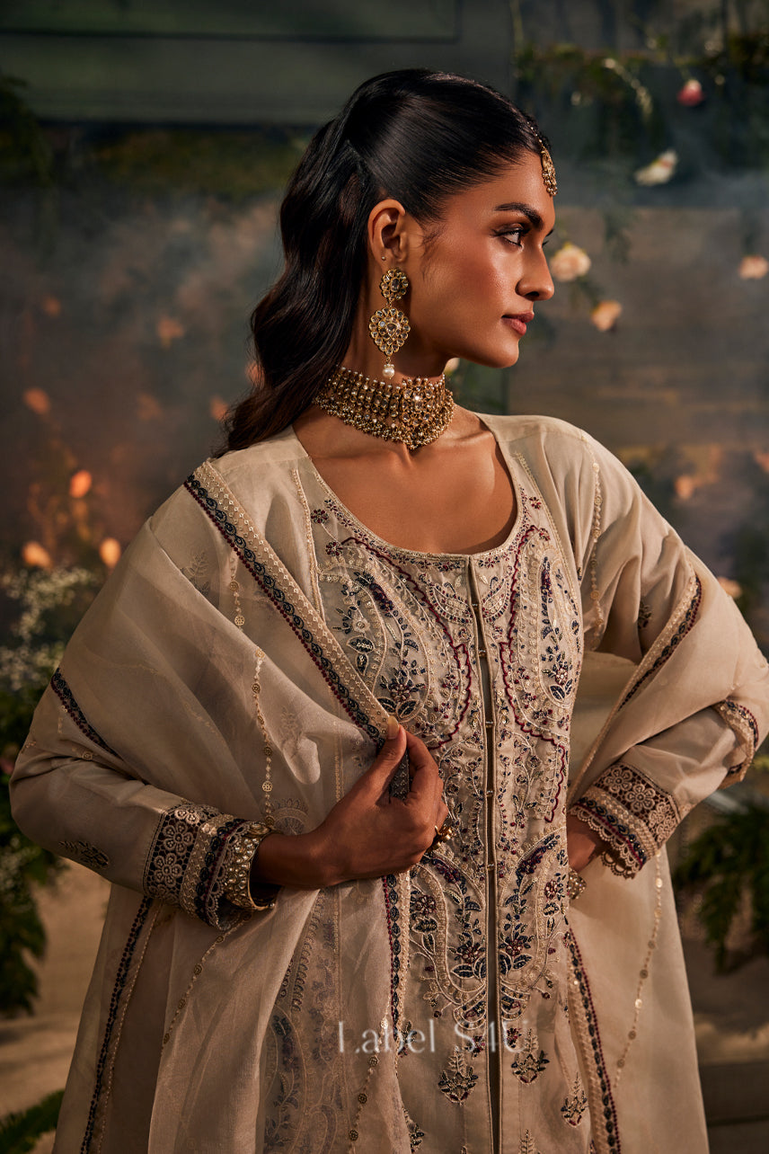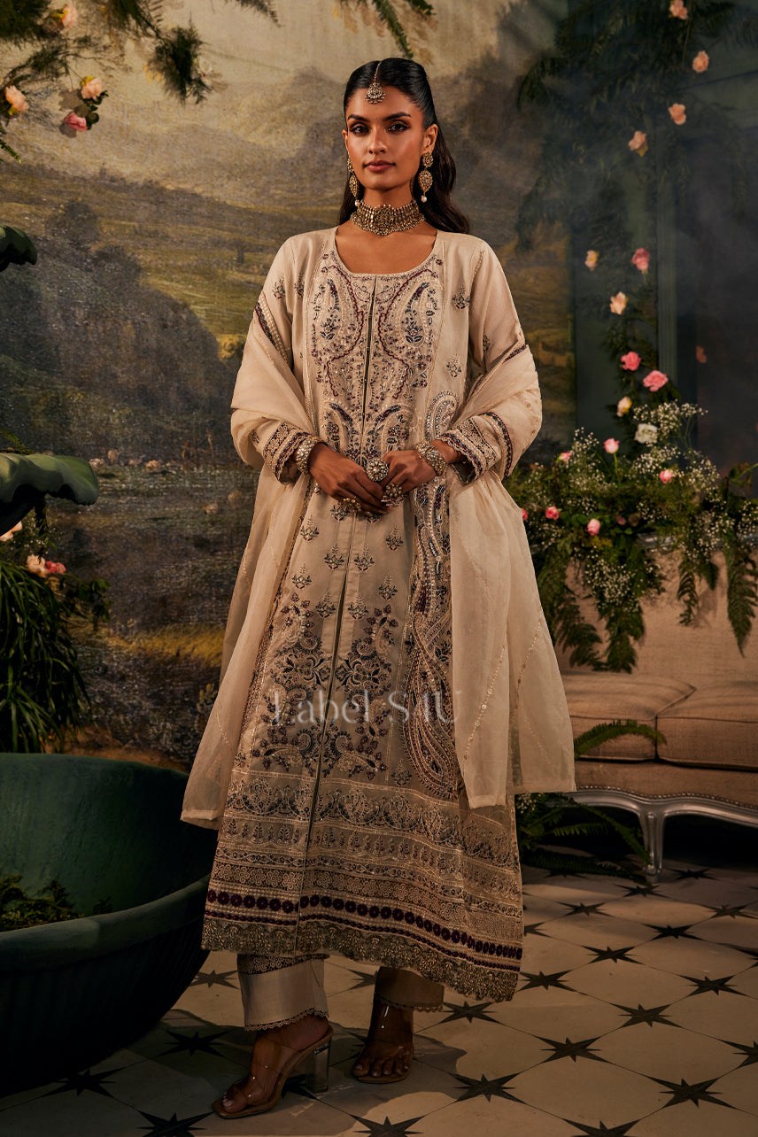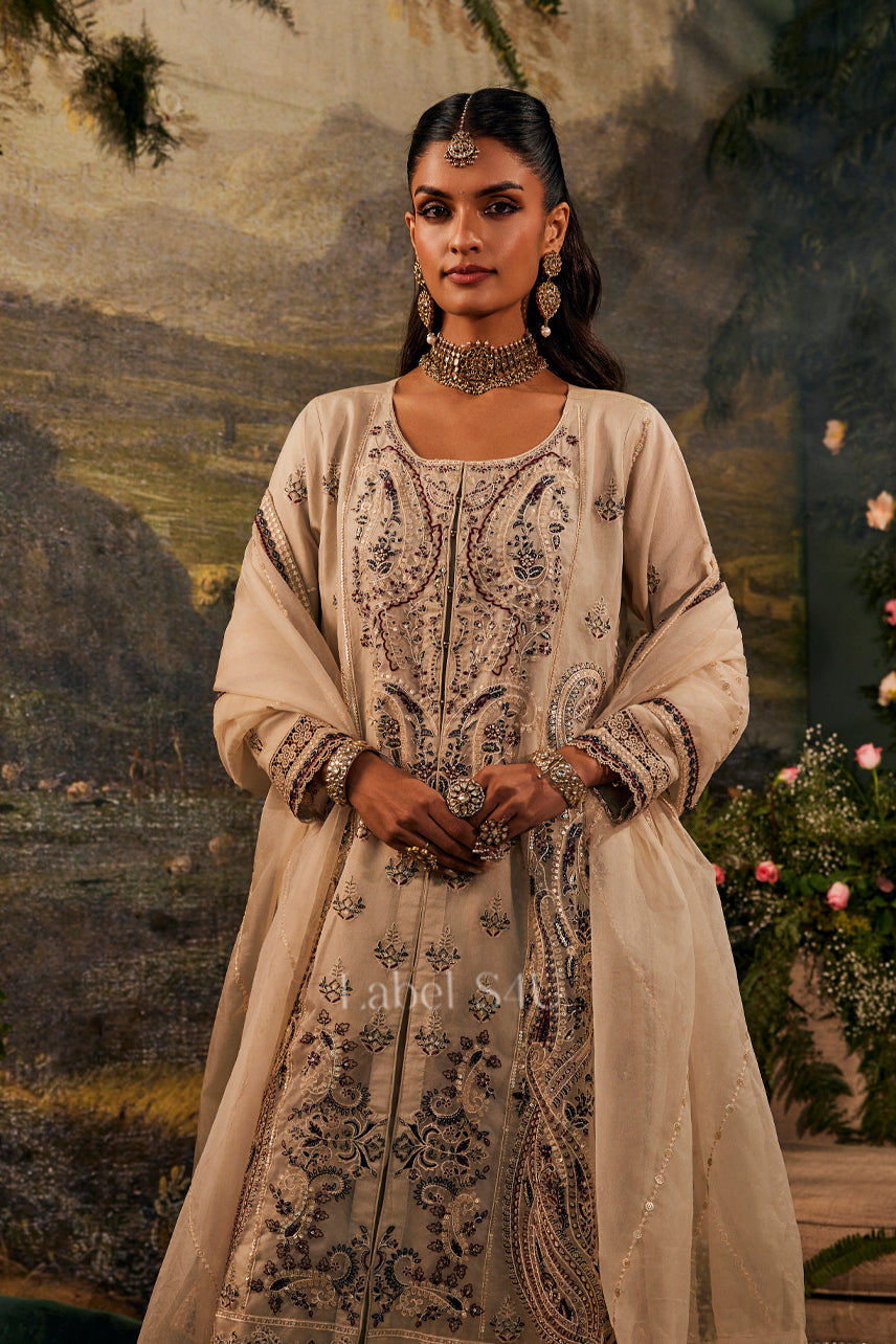 Crafted in lightweight organza fabric, this elegant ivory embroidered anarkali set features intricate traditional motifs with detailed borders and a soft, flowy dupatta for a graceful finish. Perfect for women who love timeless ethnic wear, it’s ideal for festive occasions, weddings, family functions, and evening celebrations. Style with statement jewellery and heels for a refined festive look.