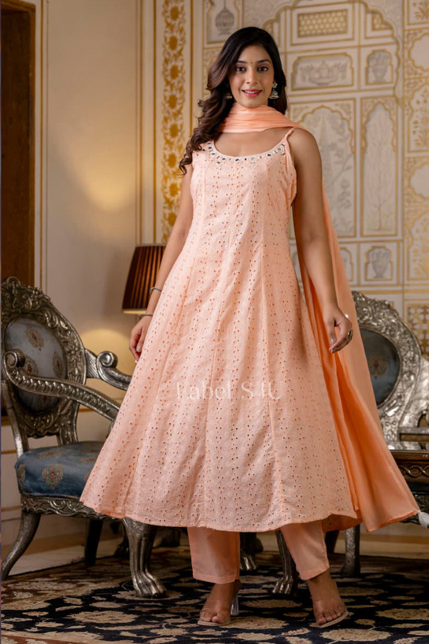 This elegant Anarkali set is crafted in breathable Schiffli fabric, featuring delicate all-over embroidery that adds soft texture and graceful charm. The flowy silhouette offers effortless movement, making it a refined pick for festive and occasion wear with all-day comfort.