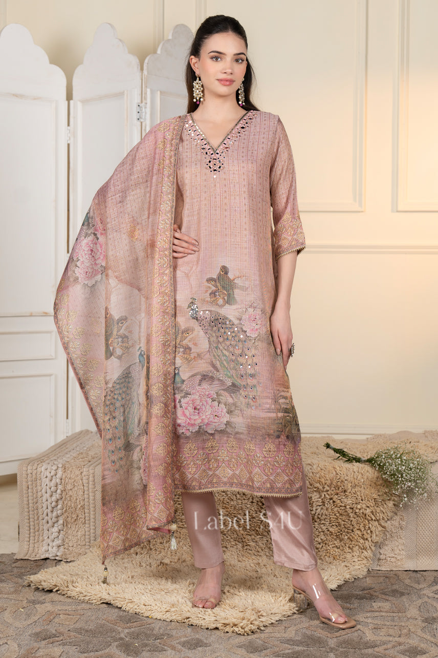 A graceful blend of softness and charm, this rose gold-printed suit brings effortless elegance to your festive wardrobe. Designed in a straight silhouette with delicate floral prints and a beautifully coordinated dupatta, this floral kurta set feels light, refined and easy to carry. The breathable fabric keeps you comfortable while the subtle detailing adds a polished finish.