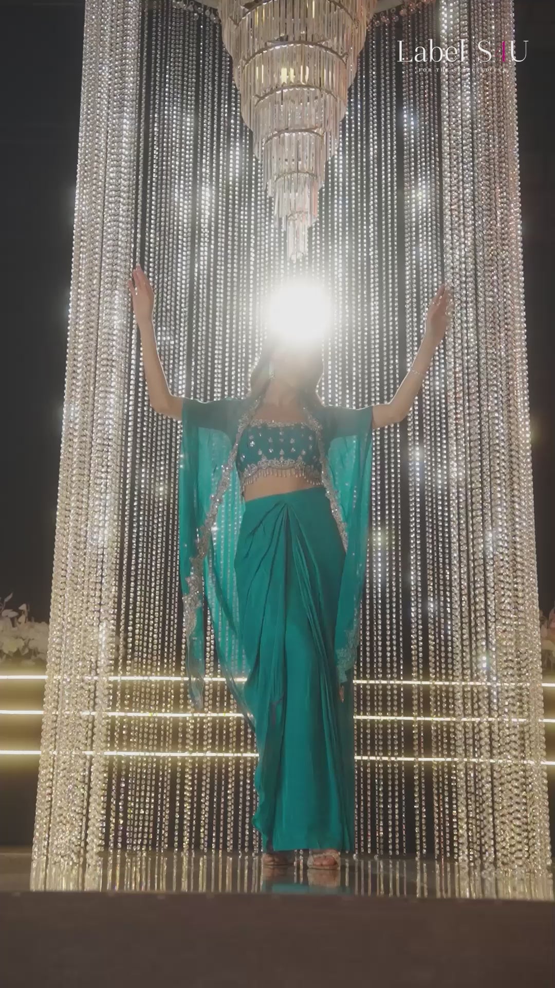 Elevate your style with this stunning teal draped skirt set, designed with a modern silhouette and elegant details. The outfit includes a beautifully hand worked blouse and a lightweight cape adorned with intricate handwork. The draped skirt offers effortless wear and a flawless fall, making it ideal for weddings, celebrations, cocktail parties, and festive events. This fashionable three-piece set blends tradition and contemporary style, giving you a refined and glamorous appearance.