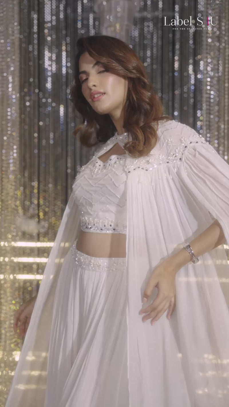 Elevate your festive wardrobe with this ethereal white or orange cape palazzo set, featuring a hand-embellished blouse, flowy pleated palazzos, and a dramatic cape that adds graceful movement. The mirror and sequin detailing brings soft luminosity, making it perfect for weddings, cocktails, and modern celebrations. Crafted for comfort and statement style, this contemporary ensemble blends elegance with effortless charm your go-to look for any glamorous occasion.