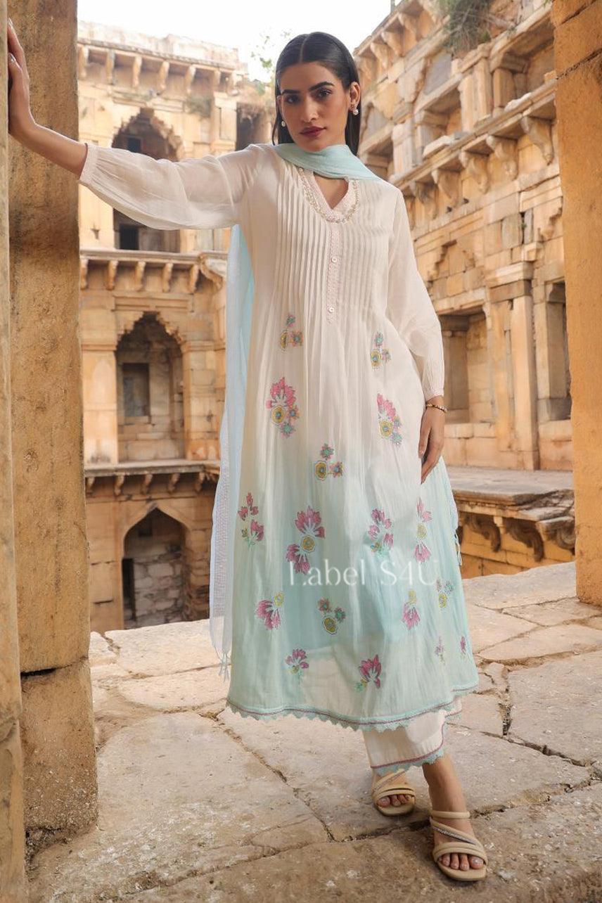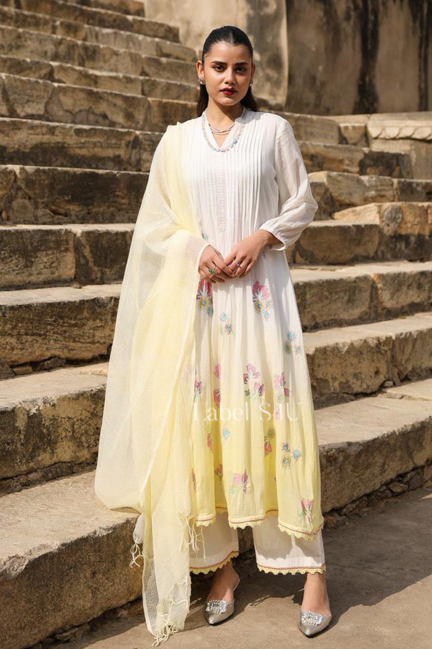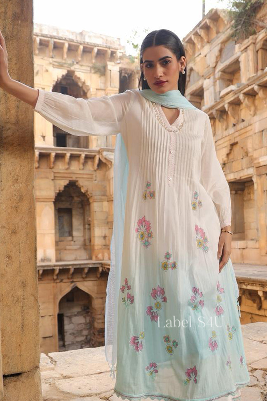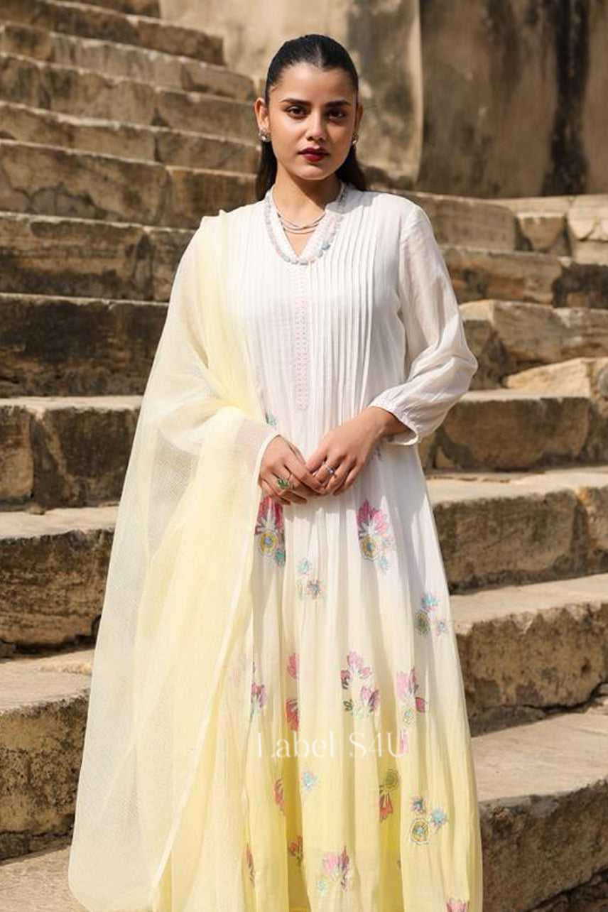 Soft, graceful, and effortlessly elegant, this white anarkali suit is designed for refined daytime celebrations. The flowy silhouette features delicate floral embroidery scattered across the hem, paired with straight pants and a light dupatta for a complete look. Crafted in a breathable, lightweight fabric with a smooth fall, it offers comfort with timeless charm. A perfect blend of simplicity and feminine elegance.
