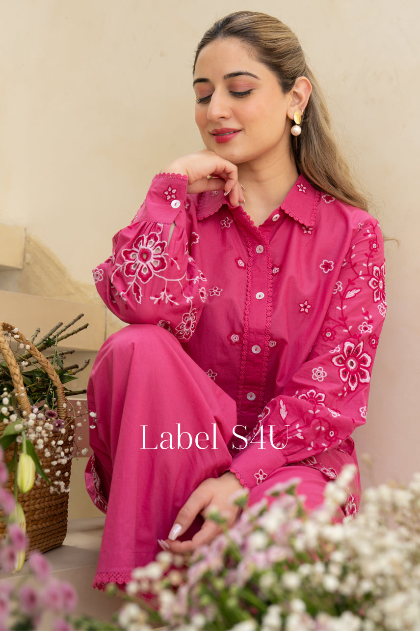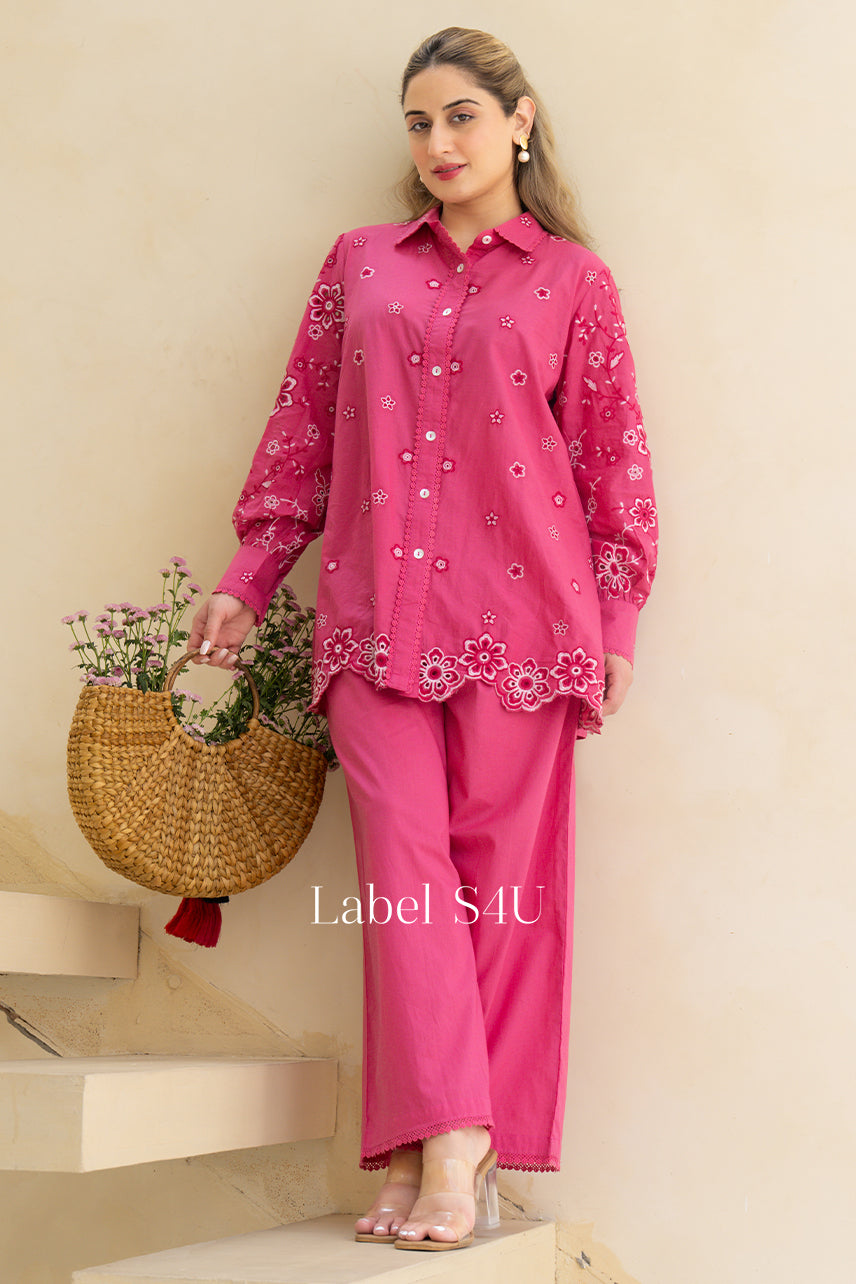 Step into effortless charm with this pink co-ord set for women, designed in a relaxed shirt-style silhouette with delicate embroidery that feels both modern and graceful. Crafted in a soft, breathable fabric with a smooth finish, it offers all-day comfort while looking polished. The matching straight pants complete the look, making it a go-to embroidered coord set for festive brunches, small gatherings, or travel days.