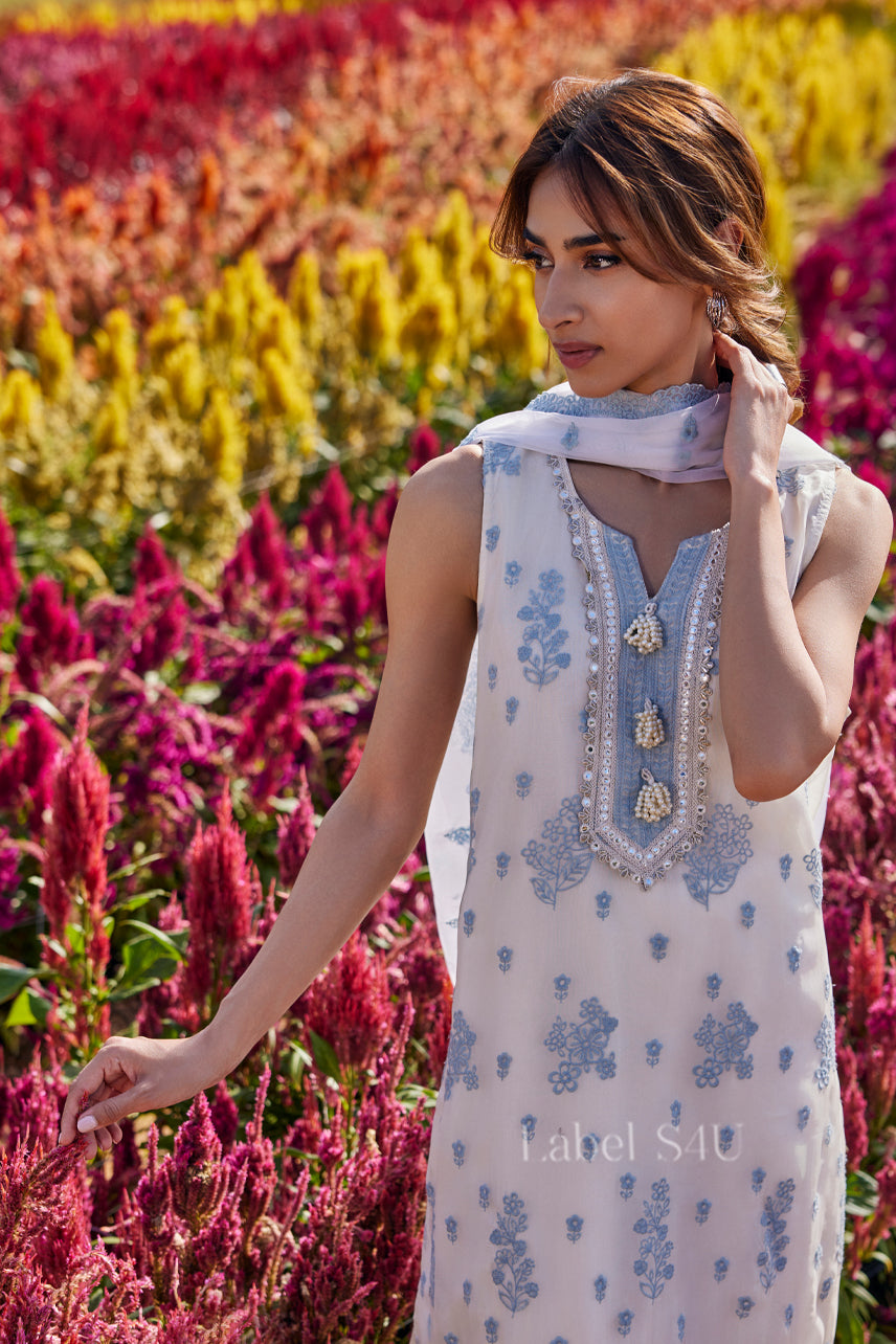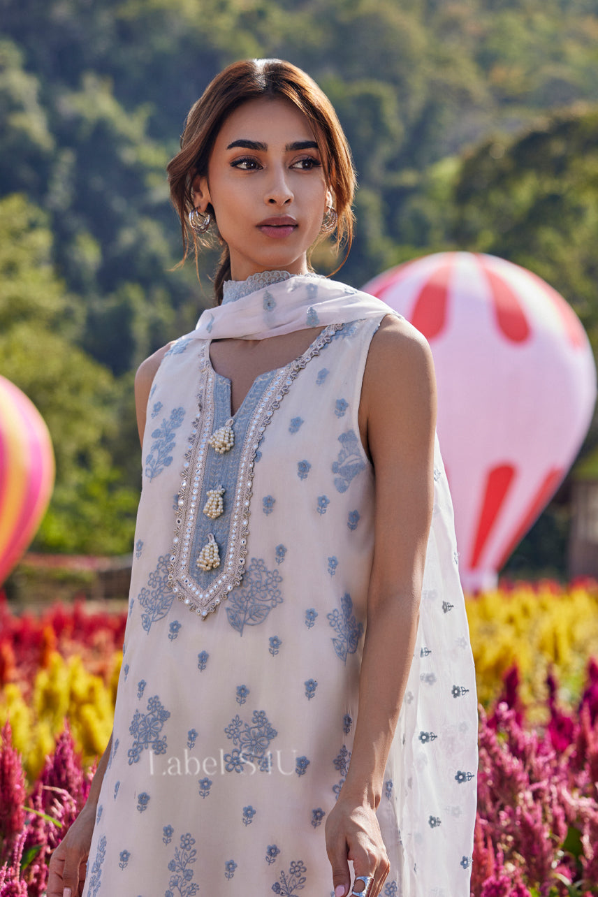 Fresh and elegant, this white embroidered suit features delicate blue floral motifs with a beautifully detailed neckline and border finish. The straight-fit kurta is paired with coordinated wide pants and a light dupatta for a complete, graceful look. Crafted in soft, breathable fabric with a smooth fall, it feels comfortable while looking refined. A timeless outfit perfect for effortless festive dressing.