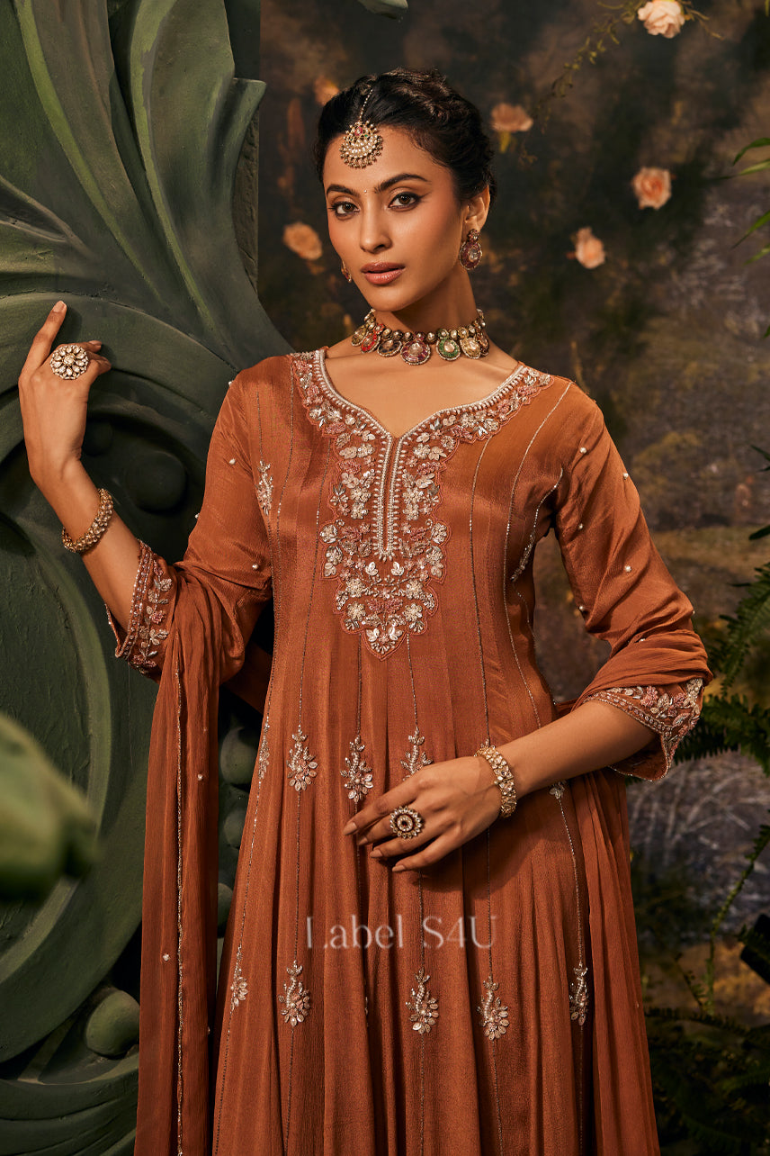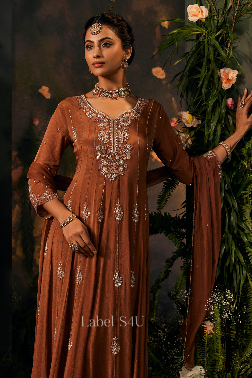 Graceful and statement-worthy, this rust anarkali set is designed for elegant festive moments. The flowy silhouette features detailed handwork on the neckline and scattered motifs throughout, paired with a matching dupatta for a complete look. Crafted in a soft, lightweight fabric with a beautiful fall, it offers comfort with rich traditional appeal. A timeless outfit that feels regal yet easy to wear.