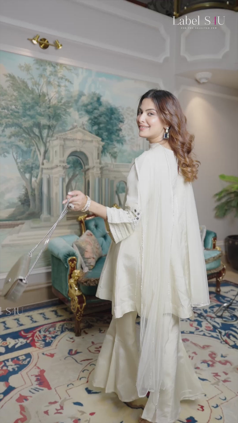 Step into timeless elegance with our Ivory Charm-Suit Set, designed to make every occasion shine. This beautiful three-piece set features a tissue kali kurta, matching palazzo pants, and a soft net dupatta. The kurta is detailed with delicate mirror work, giving it the perfect blend of traditional charm and modern grace. The flared sleeves and A-line silhouette add sophistication, while the light ivory-golden hue makes it ideal for daytime events, festive gatherings, or family celebrations. Pair it with statement earrings and heels for an effortlessly classy look.