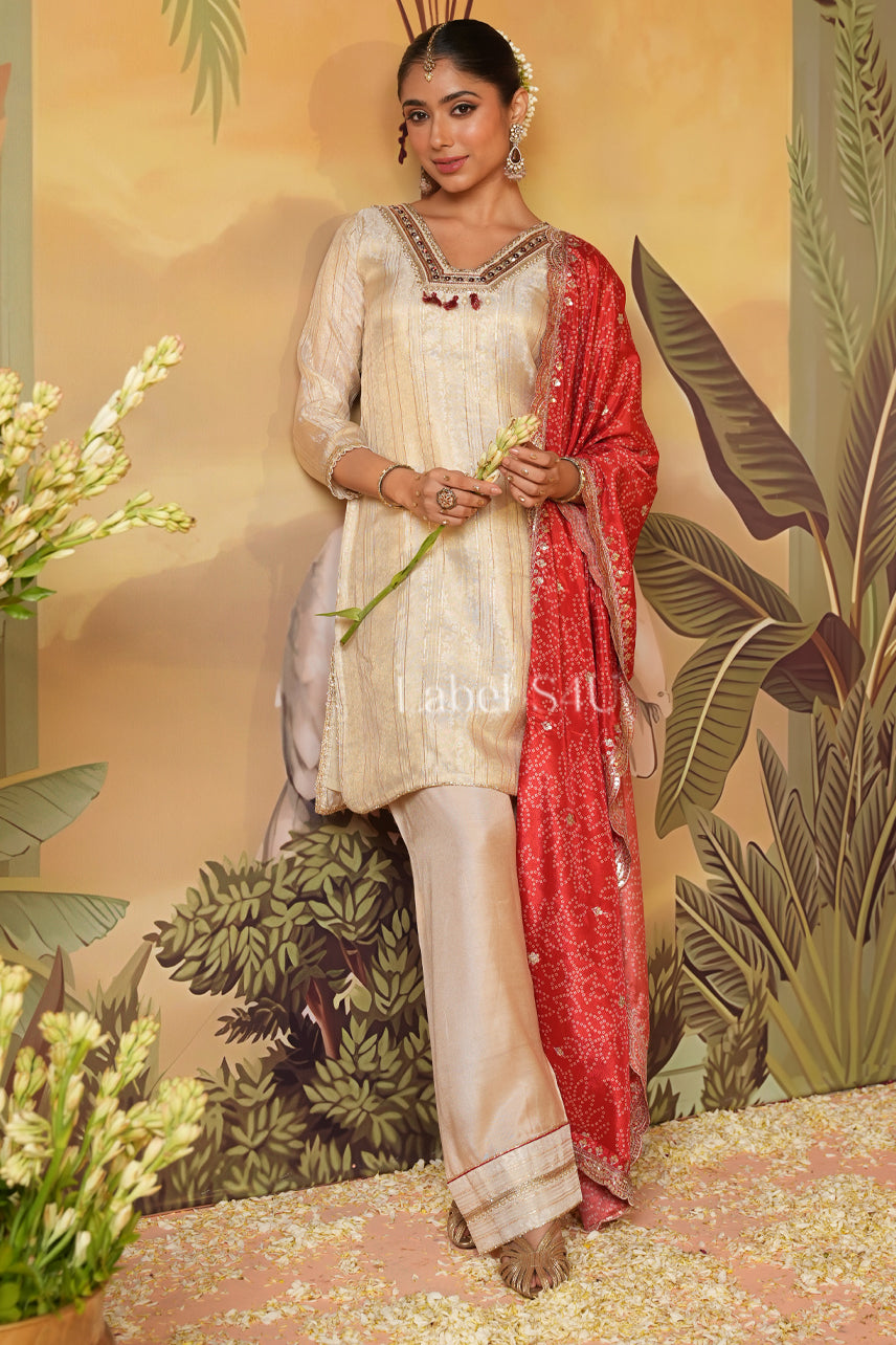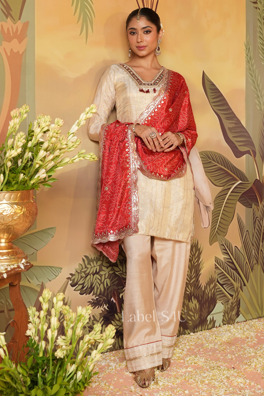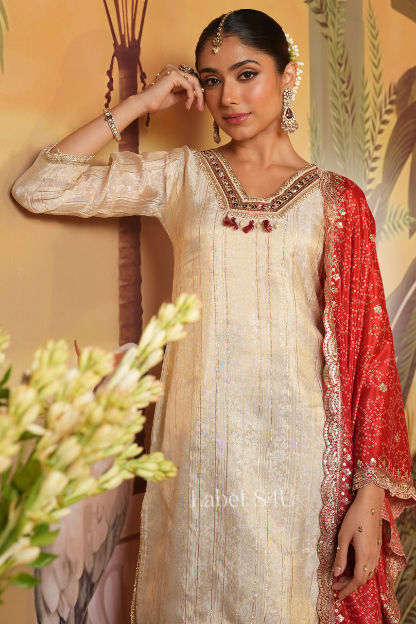 This beige silk suit set with a red dupatta is a must-have festive wear for every modern Indian woman. The kurta is designed with minimal embroidery for a refined look, while the red dupatta adds a regal pop of color with its intricate patterns. Ideal for wedding functions, sangeet nights, Karwa Chauth, and Diwali parties, this outfit is the perfect blend of tradition and contemporary style.