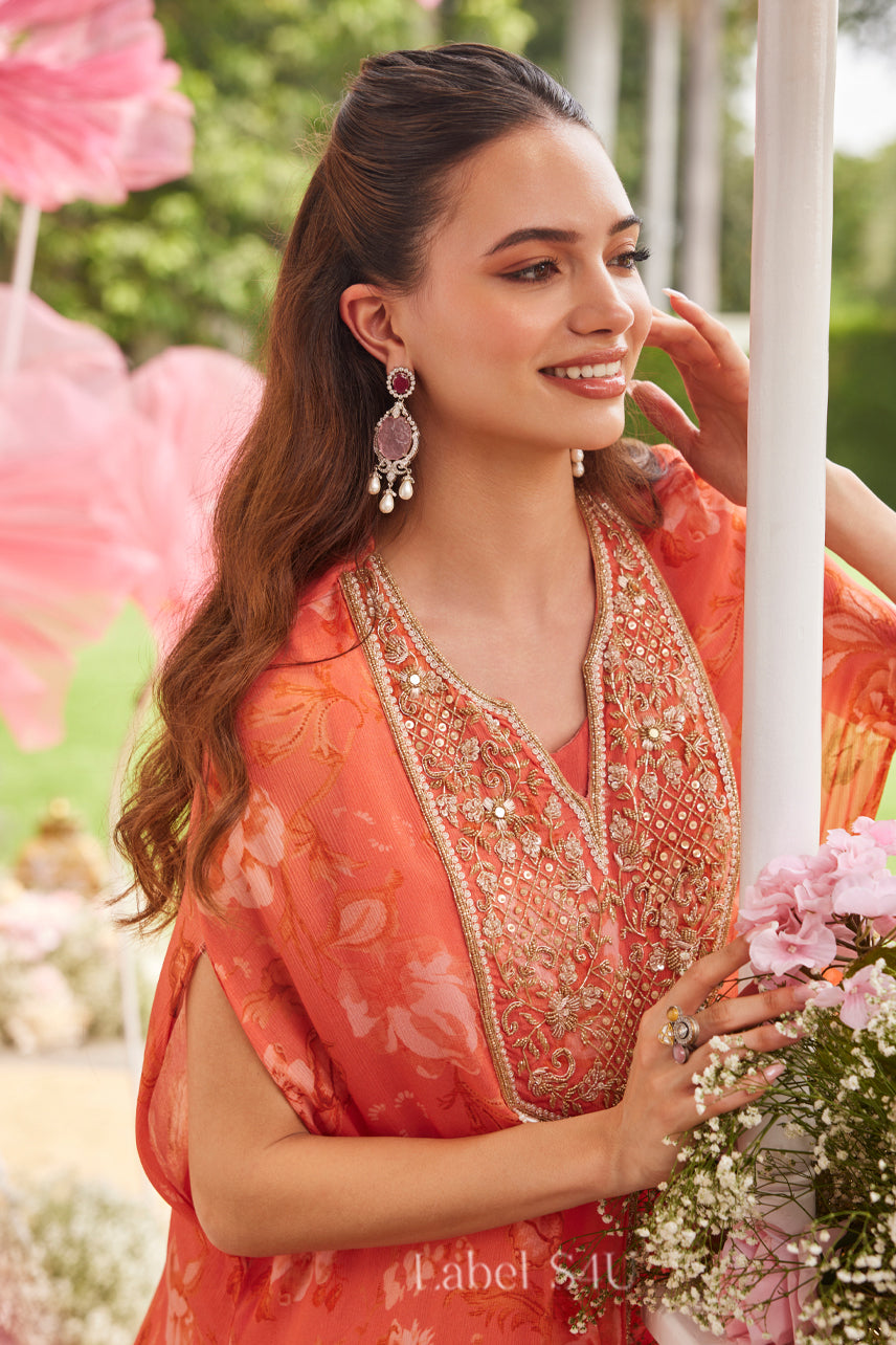 This stunning coral set is designed for the modern woman who loves to balance tradition with trend. The flowy, floral-printed center slit is beautifully enhanced with intricate handwork at the neckline, adding just the right touch of opulence. Paired with a sharara, the outfit offers comfort without compromising on elegance. Perfect for festive occasions, sangeet nights, or even chic destination weddings, this set is a wardrobe essential for effortless glamour.