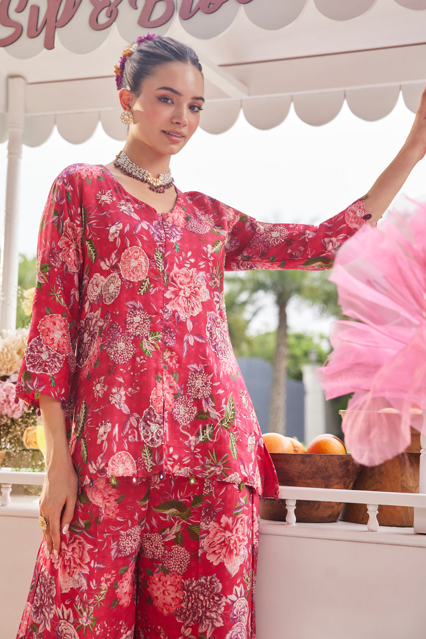 Step into your bold girl era with Flaunt It Easy-Sharara Co-Ord Set — a floral co-ord that brings the perfect balance of elegance and ease. The kurta features a relaxed silhouette with 3/4th sleeves, paired with statement flared bottoms for that effortlessly glam touch. Designed in vibrant red hues with blooming prints, this look is made for brunches, vacations, and everything in between. Because who says you can’t slay and stay comfy?