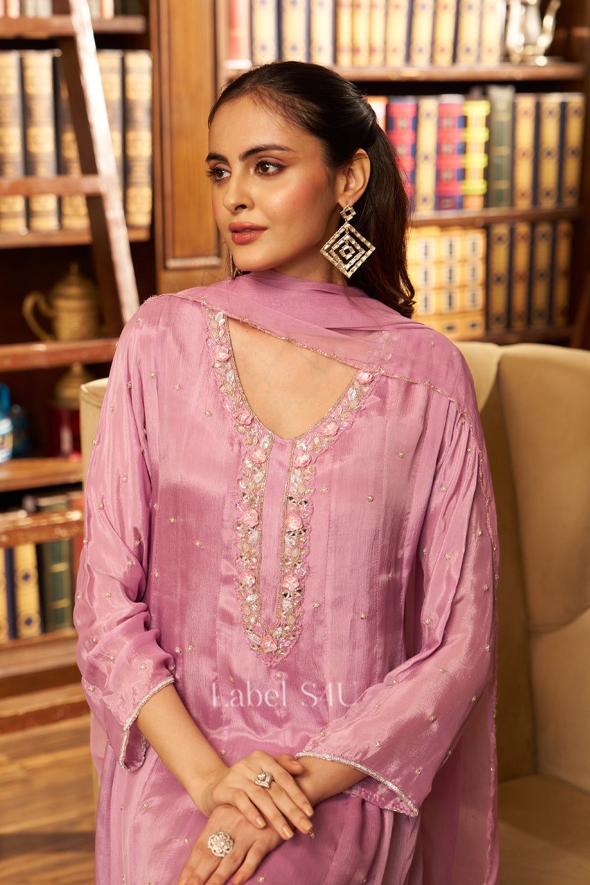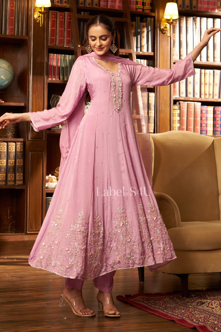 Make an elegant statement in this blush pink anarkali set designed with a flowy, floor-grazing silhouette and intricate handwork along the hemline and neckline. The kurta features soft pleats, delicate embellishments, and sheer sleeves, paired with straight pants and a matching dupatta. Crafted in a lightweight, fluid fabric with a graceful fall, it offers comfort without compromising on festive charm.