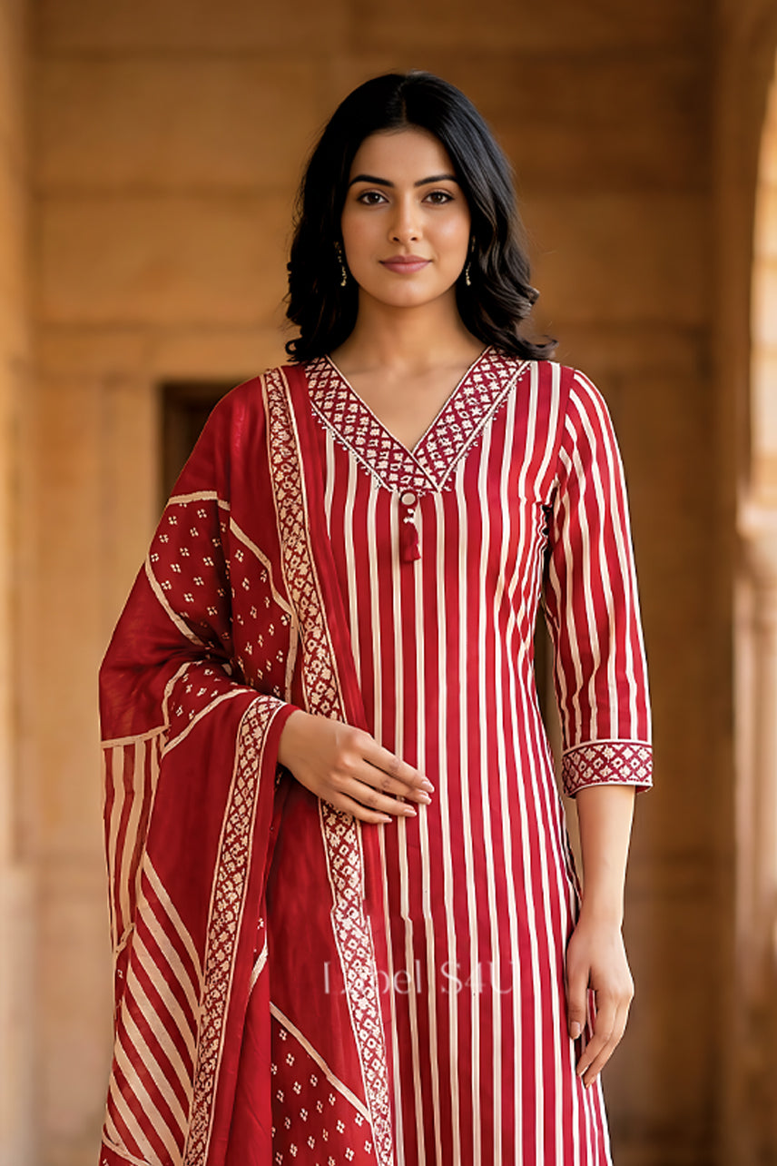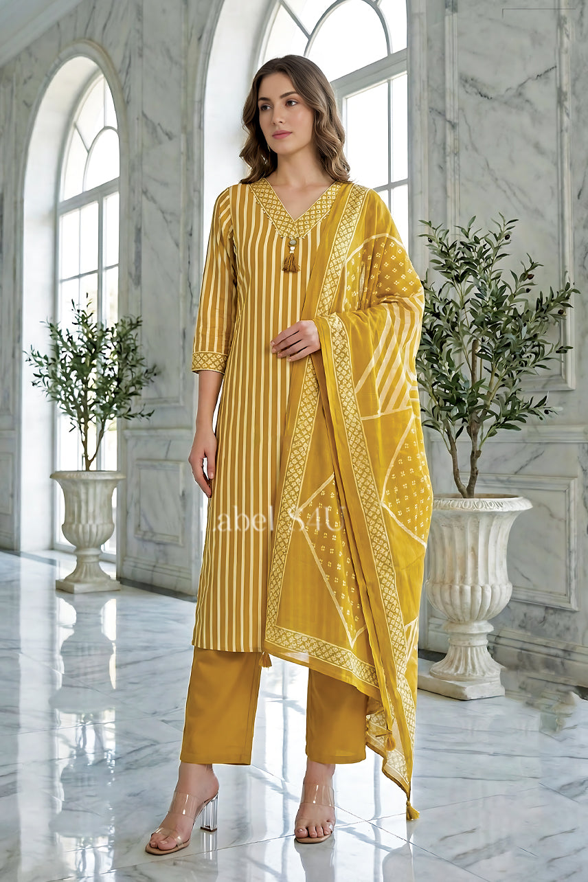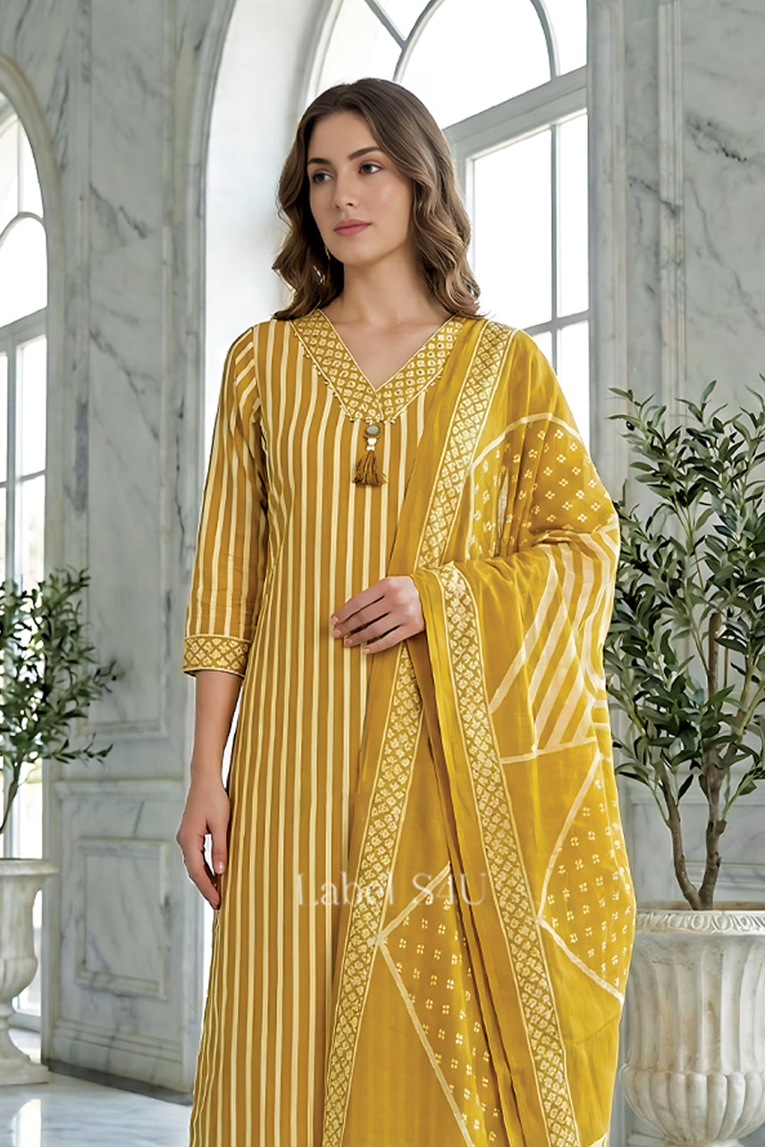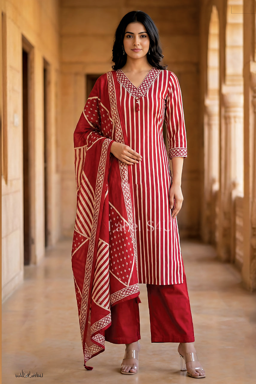 Structured yet effortless, this ethnic suit set blends clean vertical stripes with a detailed V-neckline for a refined, elongated look. Paired with tailored straight pants and a statement bordered dupatta, this everyday festive wear piece balances tradition with minimal modern styling. Lightweight and breathable, it’s designed for women who prefer subtle impact over heavy embellishment.