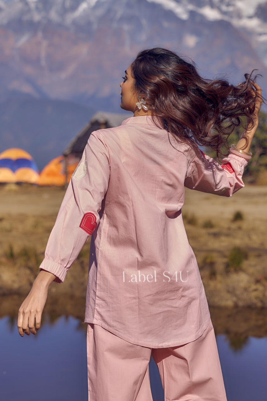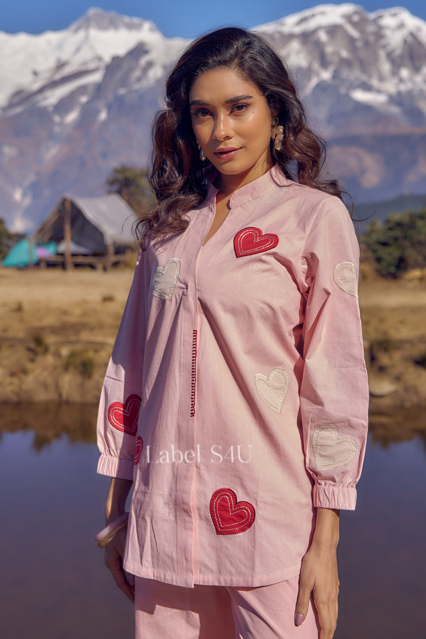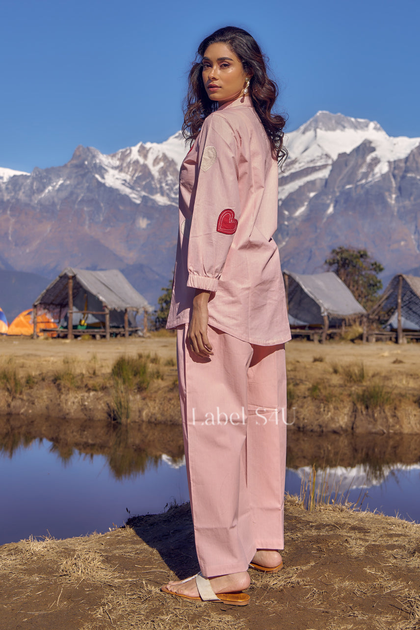 Playful and easygoing, this pink co-ord set features a relaxed straight shirt with statement heart appliqué detailing, paired with wide-leg matching pants. Designed in soft, breathable fabric with a clean silhouette, this casual summer outfit blends comfort with a modern, youthful vibe. Light, airy, and effortless it’s perfect for women who love stylish everyday dressing.