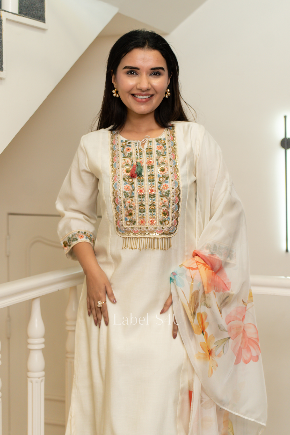 Step into soft elegance with this Delicate Floral Suit Set, made to brighten your everyday festive moments. The straight kurta with fine embroidered neckline, paired with pants and a flowy floral dupatta, creates a graceful and easy look. Crafted in smooth, lightweight fabric, it feels comfortable all day while looking effortlessly refined. A perfect choice when you want subtle charm with a touch of freshness.