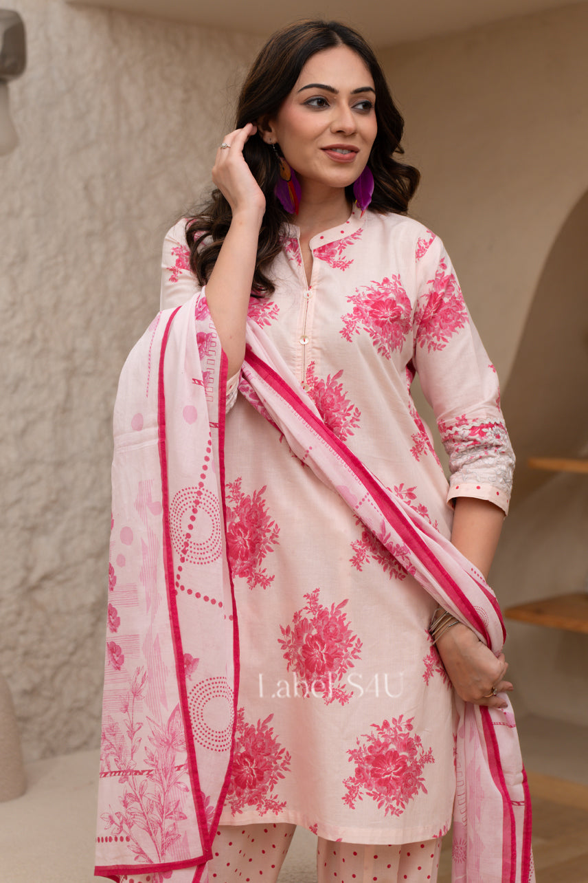 Step into effortless elegance with this floral suit set, designed in a soft pink base with vibrant pink prints. The straight kurta paired with coordinated bottoms and a lightweight dupatta creates a refined yet easy silhouette. Crafted in breathable cotton-blend fabric, it offers all-day comfort with a graceful festive appeal. Perfect for intimate celebrations, this set blends timeless charm with modern simplicity.