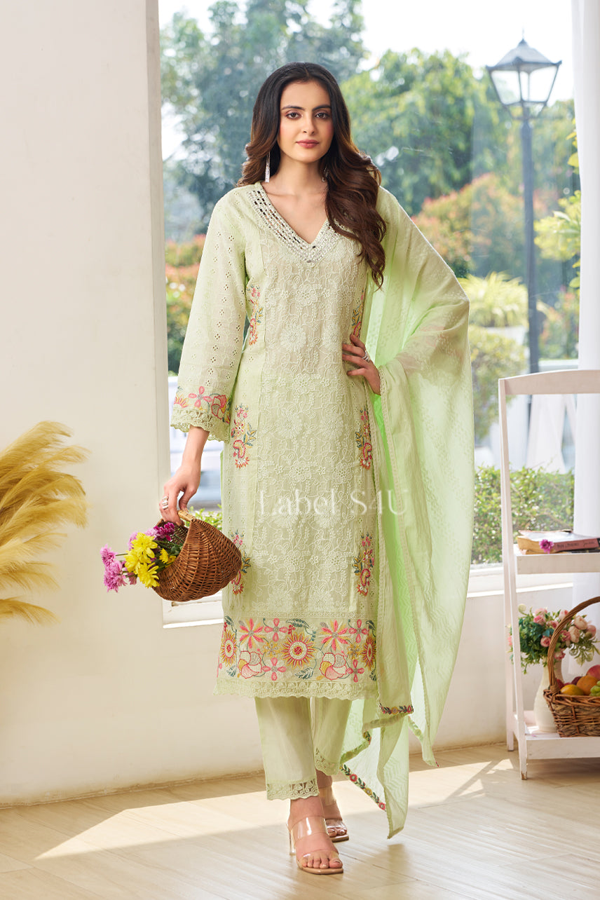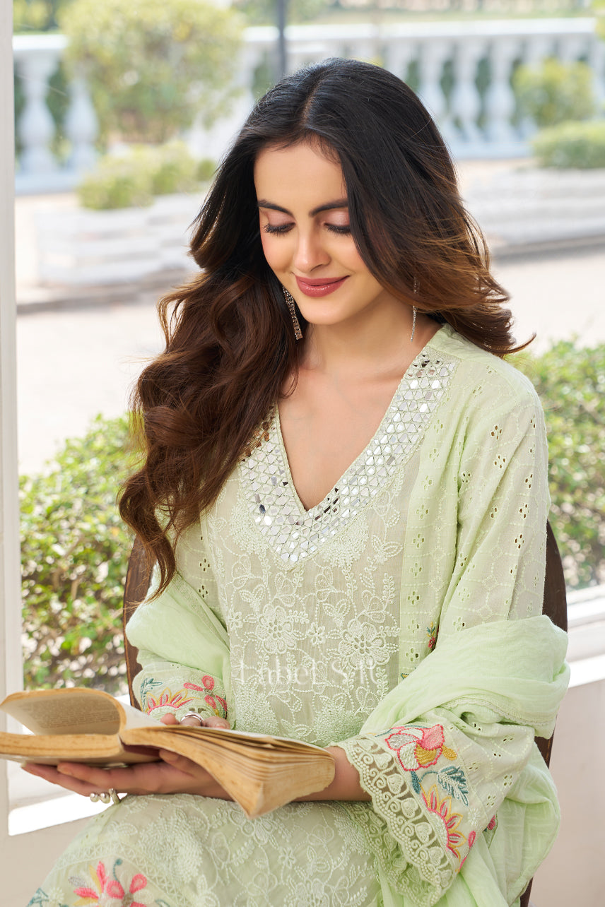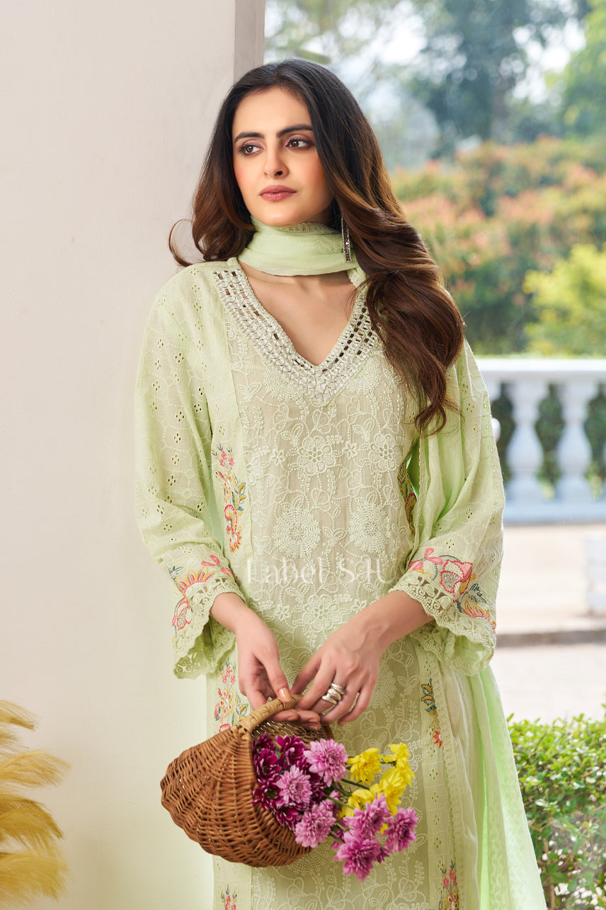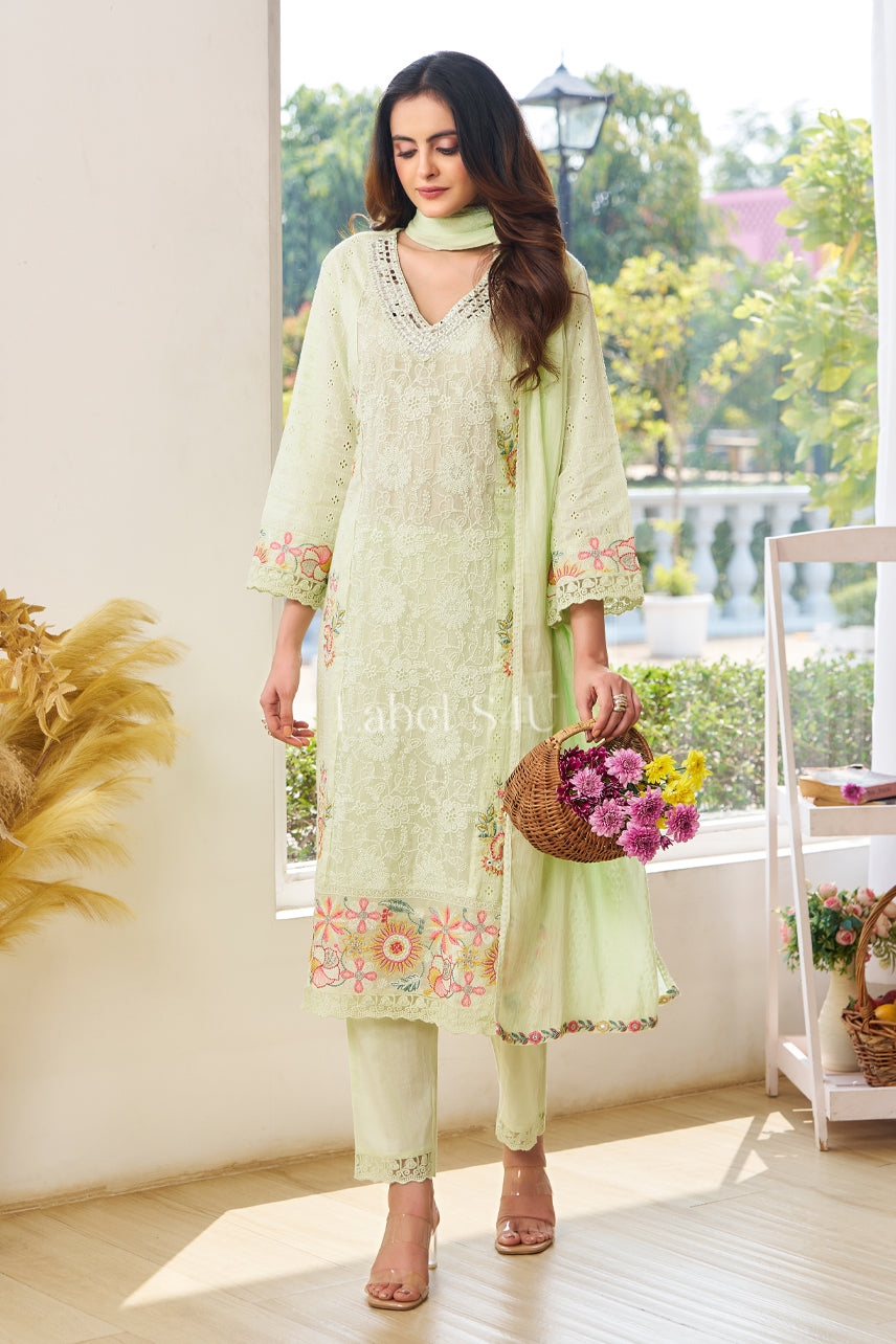 Celebrate the freshness of summer with this elegant pista green embroidered suit set. Designed for women who love graceful and traditional ethnic wear, this outfit blends soft pastel tones with delicate floral embroidery for a refined festive look.The straight-fit kurta features intricate thread work on the neckline and subtle floral detailing along the hem and sleeves with schiffli, adding a touch of traditional charm. Paired with matching bottoms and a lightweight dupatta, this set offers comfort, breathability, and effortless elegance — making it perfect for summer celebrations.