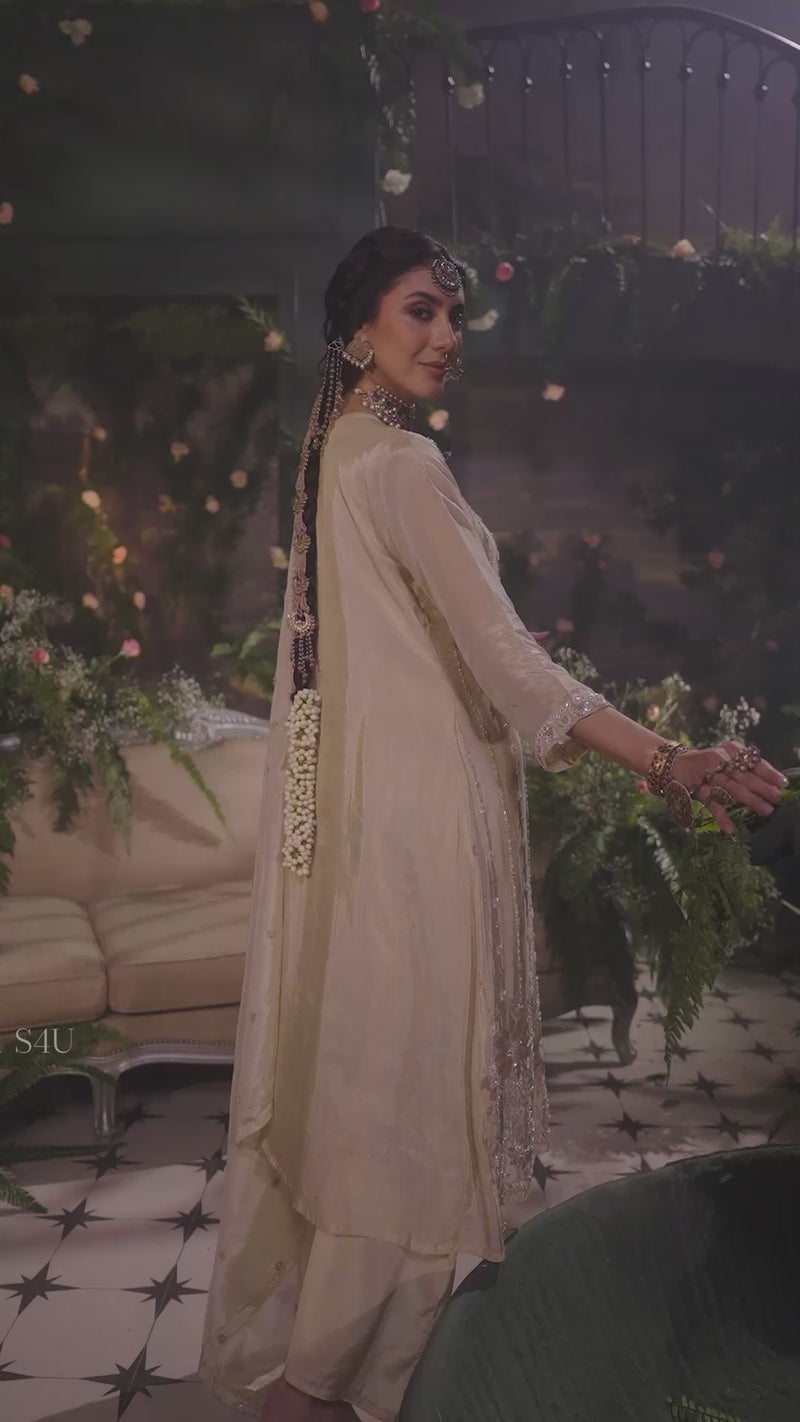 Elevate your festive wardrobe with this ivory handwork front slit Anarkali set, designed in a graceful long silhouette with a center slit for effortless movement. Crafted in soft, flowy fabric, the Anarkali features delicate hand embroidery on the neckline and panels, adding a refined festive charm. Paired with a matching dupatta, this elegant set is perfect for festive occasions, weddings, Eid celebrations, family functions, and evening gatherings. Style it with statement jewellery and heels for a timeless, sophisticated look.