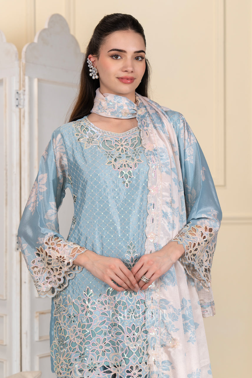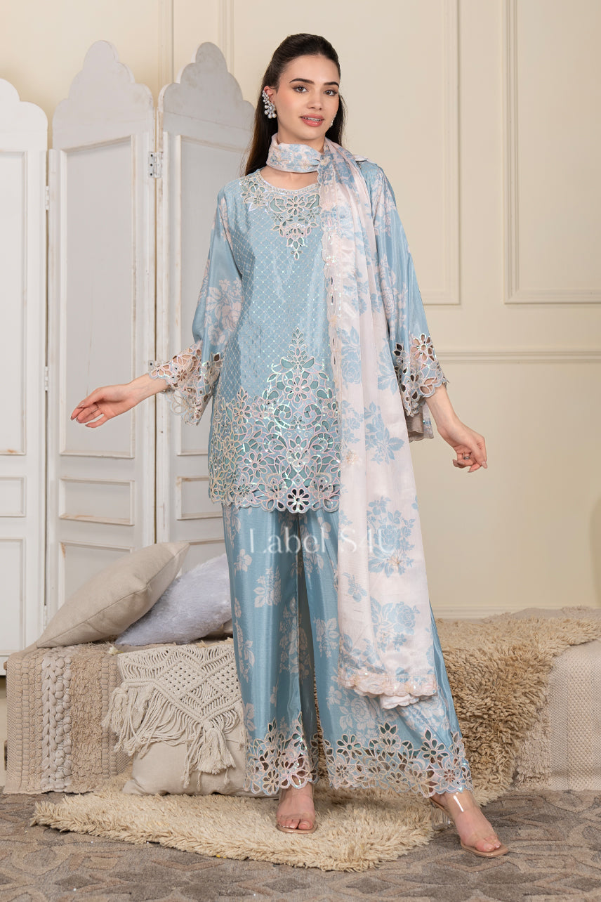 Fresh and elegant, this blue cutwork suit set is designed with delicate floral print and cutwork along the neckline and hem. Paired with flowy palazzo pants and a soft, floral printed dupatta, this festive palazzo set brings together grace and comfort in one refined look. Light, breathable, and easy to wear, it’s perfect for effortless festive dressing.