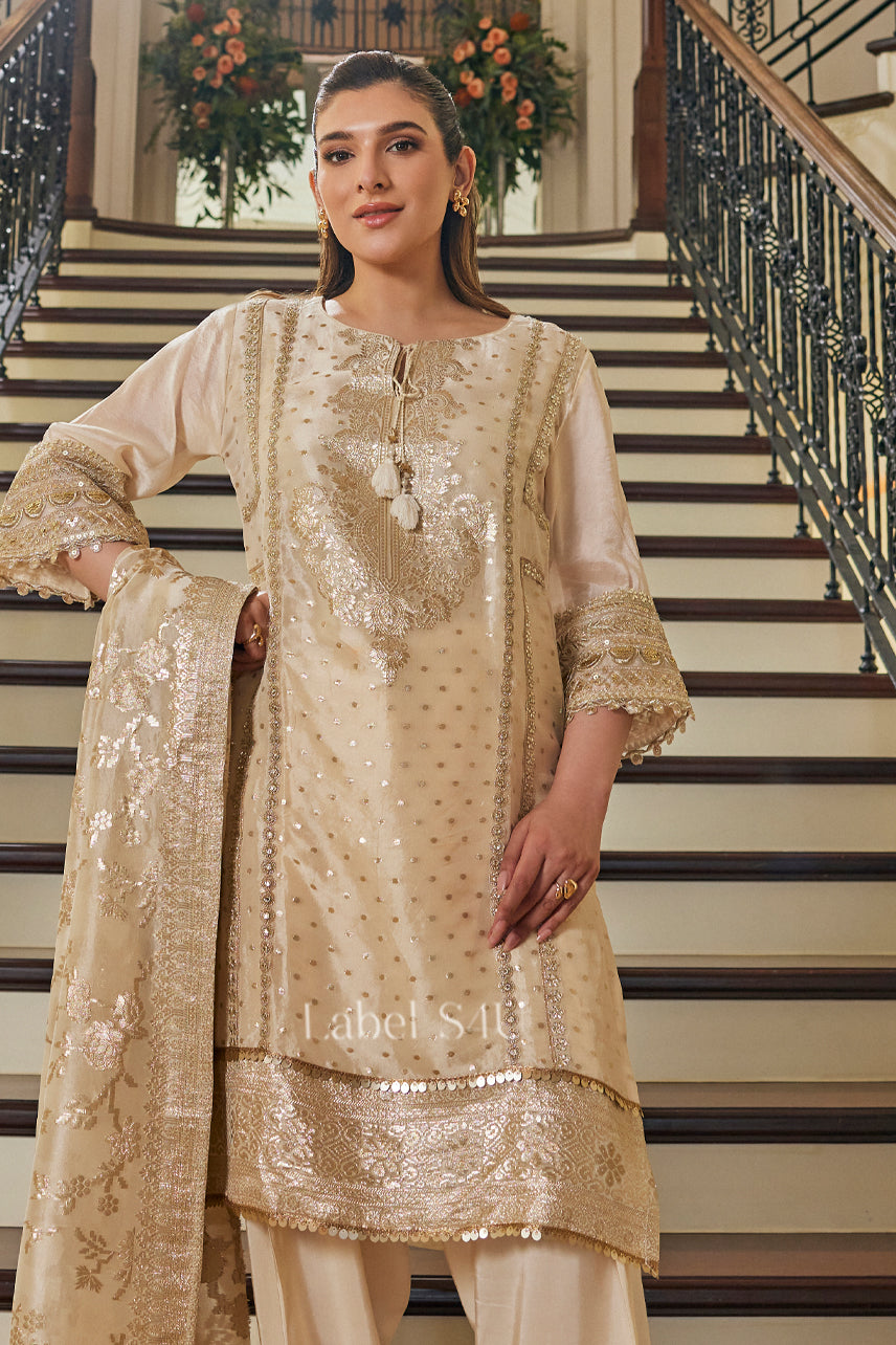 Refined and regal, this beige luxury kurta set is crafted for celebrations that matter. The straight-cut kurta features dense neckline embroidery, delicate scattered motifs, and a richly detailed hem, paired with tailored pants and a woven statement dupatta. This elegant wedding occasion outfit balances grandeur with comfort, giving you a polished, heirloom-inspired look without feeling heavy.